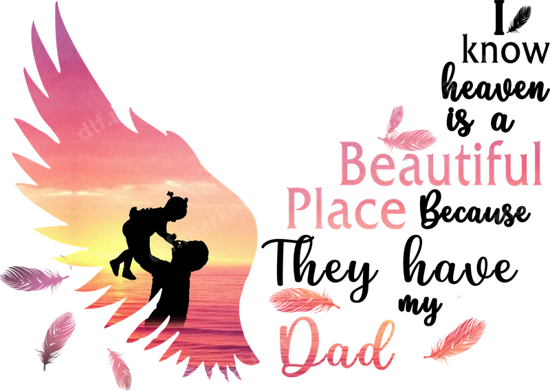 See allThis deeply moving DTF transfer features a beautiful memorial design, perfect for honoring a beloved father. The artwork showcases a tender silhouette of a dad holding his child within the embrace of an angelic wing, backdropped by a serene sunset over the ocean. Scattered feathers add a touch of grace and peace, complementing the heartfelt message: 'I know heaven is a Beautiful Place Because They have my Dad.' This high-quality, ready to press transfer is designed to create a lasting tribute, bringing comfort and remembrance to those who cherish their lost loved ones. This 'Heaven Has My Dad' heat transfer is an ideal choice for anyone seeking to keep the memory of their father alive. It's especially meaningful for daughters and sons who miss their dad, offering a comforting way to express their enduring love. Perfect for creating custom shirts to wear on Father's Day, on his birthday, or on the anniversary of his passing. It also makes a thoughtful and personal sympathy gift for someone grieving, allowing them to carry a piece of their dad's legacy with them daily. This design provides a profound visual reminder of the love that transcends earthly bounds. Applying this iron on transfer is simple and efficient, ensuring professional results on a wide range of fabrics. Our premium direct to film transfer technology is compatible with cotton, polyester, and various fabric blends, making it perfect for custom t-shirts, hoodies, bags, and more. For best results, use a heat press at 300-325°F for 15 seconds with medium pressure. Alternatively, a household iron can be used with firm, even pressure. Unlike vinyl transfers, there's no tedious weeding required – just press and peel for a beautiful, ready to wear design. You can expect exceptional quality with this apparel transfer. Our DTF prints are known for their vibrant colors, incredible detail, and a soft, comfortable feel that integrates seamlessly with the fabric. The durable heat press design is resistant to cracking, fading, and peeling, ensuring your memorial garment will last through countless washes while retaining its beauty. Crafted on professional-grade DTF film with a strong, flexible adhesive, this transfer provides a long-lasting and cherished tribute to your dad. Experience premium quality and ease of application with every dtf.market order.