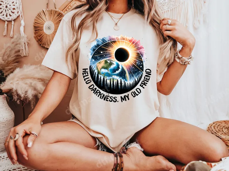 See allThis stunning DTF transfer features a mesmerizing solar eclipse, Earth, a starry night sky, and a serene forest silhouette, all encircled by the iconic phrase "HELLO DARKNESS. MY OLD FRIEND." This ready to press design beautifully merges cosmic wonder with a touch of nostalgic humor, making it a distinctive apparel transfer. Perfect for individuals who appreciate space, nature, and pop culture references, this design makes an excellent gift for meme lovers or anyone with a dry wit. It's ideal for casual wear, music events, or as a unique conversation starter. Offer a personalized heat press transfer to friends and family who love distinctive style. This direct to film transfer is simple to apply to a variety of fabrics, including cotton, polyester, and blends. For professional results, use a heat press at 300-325°F for 15 seconds with medium pressure, then peel cold. A household iron can also be used. Enjoy a durable, heat press ready transfer that requires no weeding. Our high-quality heat transfer ensures vibrant colors that resist cracking and a soft, comfortable feel. Each iron on transfer is made with premium DTF film and a strong adhesive, ensuring your custom t-shirt transfer withstands washes and maintains its striking look for years.