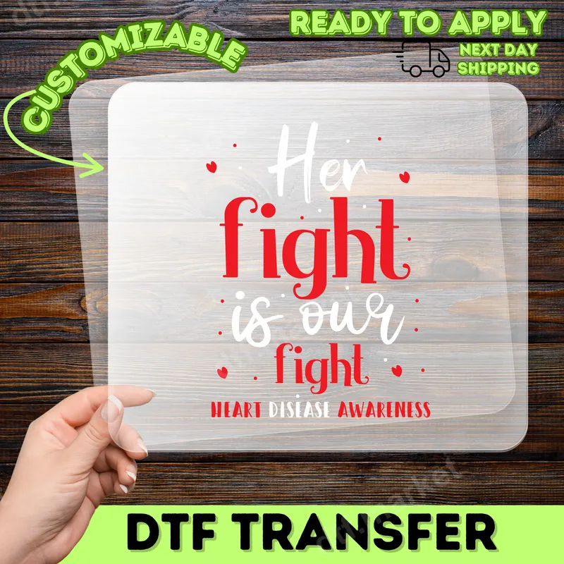 See allThis impactful "Her Fight Is Our Fight" DTF transfer is a powerful statement of solidarity for Heart Disease Awareness. Featuring bold red and white typography accented with delicate red hearts, this ready to press design radiates strength and collective support. It's a vibrant and clear representation of unity, perfect for honoring someone special or raising awareness for a vital cause. This inspiring apparel transfer is ideal for family members, friends, and caregivers of those battling heart disease, as well as survivors. It's perfect for Heart Disease Awareness Month, charity walks, fundraising events, or as a daily reminder of resilience. Create meaningful gifts for loved ones or empower your entire support squad with custom merchandise. Applying this heat press ready design is straightforward and efficient. Our high-quality iron on transfer works seamlessly on a wide range of fabrics including cotton, polyester, and their blends. Simply use a heat press at 300-325°F for 15 seconds with medium pressure. There's no need for tedious weeding or layering, making custom apparel projects quick and easy. Crafted using professional-grade DTF film, this t-shirt transfer ensures a vibrant, long-lasting finish that resists cracking and peeling. The colors remain brilliant wash after wash, and the transfer itself is soft to the touch, providing superior comfort. Deliver professional, retail-quality results every time with this durable and beautiful heat transfer design.