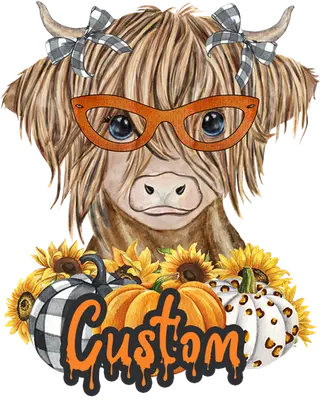 Bring rustic charm and a touch of autumn fun to your wardrobe with this delightful Highland Cow DTF transfer. This adorable design showcases a shaggy brown cow sporting stylish orange cat-eye glasses and cute grey buffalo plaid bows on its horns. Below, a vibrant cluster of yellow sunflowers and an array of festive pumpkins – including classic orange, leopard print, and buffalo plaid – create a cozy fall backdrop. The playful, drippy orange "Custom" text adds a personalized, Halloween-inspired flair, making this a truly unique and ready to press design for any project. This charming heat transfer design is perfect for fall enthusiasts, crafters, small business owners, and anyone who adores farm animals and autumn aesthetics. It makes an excellent iron on transfer for creating personalized gifts for teachers, moms, or friends. Ideal for celebrating the fall season, Halloween parties, pumpkin patch visits, or simply adding a cozy touch to your everyday wear, this design is versatile for various occasions and audiences, including Etsy t-shirt sellers and boutique owners looking for unique inventory. Applying this heat press transfer is a breeze! It adheres beautifully to cotton, polyester, cotton-poly blends, and even nylon fabrics. For best results, use a heat press at 300-325°F for 15 seconds with medium pressure, or apply with a household iron (firm pressure, no steam). No weeding or intricate layering required – just peel and press! It's perfect for custom t-shirts, hoodies, sweatshirts, tote bags, pillow covers, baby onesies, aprons, and denim jackets. To ensure lasting durability, wash garments inside out in cold water and tumble dry low. Experience professional quality with this ready to press transfer. Featuring vibrant, full-color printing and exceptional fine detail, the design is crack-resistant and soft to the touch, avoiding the heavy, stiff feel of traditional vinyl. Each direct to film transfer is printed on premium DTF film with a strong, reliable adhesive backing, ensuring a smooth application and professional results on every garment. Elevate your apparel with this eye-catching and durable DTF transfer.