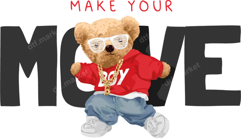 See allThis vibrant DTF transfer features a cool, hip-hop-style teddy bear wearing white shutter shade sunglasses, a gold chain, a red "BOY" hoodie, blue jeans, and white sneakers. The bear is in a dynamic pose, surrounded by the bold text "MAKE YOUR MOVE" in red and black lettering. This eye-catching ready to press design exudes streetwear cool and a confident, energetic vibe, perfect for making a statement. This unique design is ideal for anyone who loves streetwear, hip hop culture, or simply a fun, expressive graphic. It's perfect for personalizing casual wear, creating custom gifts for friends or family, or adding urban flair to merchandise. Whether for a birthday, a concert outfit, or just everyday style, this direct to film transfer is sure to turn heads. It’s also a fantastic iron on decal for dance crews or fashion projects. Our high-quality heat press transfers are incredibly versatile and easy to apply. They work seamlessly on cotton, polyester, and various blends. Simply use a heat press at 300-325°F for 15 seconds with medium pressure. Unlike vinyl, there's no weeding required, simplifying your customization. For best results, allow the garment to cool completely before peeling the film. Experience professional-grade results with our durable and vibrant heat press designs. Each transfer is printed using premium inks on specialized DTF film, ensuring crisp details, excellent color saturation, and a soft, flexible feel. These heat press ready transfers are crack-resistant and designed to withstand numerous washes, maintaining their bold appearance for long-lasting wear. Get a professional finish without the hassle.