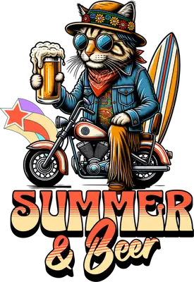 Hippie Cat Motorcycle DTF Transfer with Beer & Surfboard - Summer Vibes
