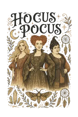 See allThis enchanting Hocus Pocus DTF transfer features a beautifully detailed illustration of the iconic Sanderson sisters, ready to bring their spellbinding charm to your next project. Framed by mystical elements like a crescent moon, sparkling stars, ancient crystals, and delicate botanicals, this design captures a vintage, witchy aesthetic. A prominent Deaths-head hawkmoth adds a touch of dark enchantment, making this a truly unique and ready to press piece for fans of the classic Halloween movie. The rich, earthy tones create a timeless and magical vibe perfect for the spooky season. This captivating design is perfect for Hocus Pocus superfans, Halloween enthusiasts, and anyone who loves a touch of spooky magic. It's an ideal iron on transfer for creating custom apparel for fall festivals, themed movie nights, or group outfits for Halloween parties. Small t-shirt businesses and Etsy sellers can easily offer trending designs, while crafters and DIYers will find it adds a professional flair to their creations. It also makes a fantastic, easy-to-apply heat transfer design gift for friends and family who adore the Sanderson sisters. Applying this heat press transfer is quick and effortless. It adheres seamlessly to a wide range of materials including cotton, polyester, cotton-poly blends, and even nylon. For best results, use a heat press at 300-325°F for 15 seconds with medium pressure. A household iron can also be used with careful application. Say goodbye to tedious weeding – simply peel and press! This design is perfect for custom t-shirts, cozy hoodies, stylish sweatshirts, practical tote bags, charming pillow covers, and even personalized denim jackets. Remember to wash garments inside out and tumble dry on low heat for enduring vibrancy and durability. Experience superior quality with this ready to press transfer. It boasts vibrant, full-color printing that captures every fine detail of the intricate artwork. Enjoy a durable finish that is crack-resistant and soft to the touch, avoiding the heavy, stiff feel often associated with traditional vinyl. Each direct to film transfer is expertly printed on premium DTF film, engineered with a strong adhesive backing to ensure professional, long-lasting results every single time you apply it.