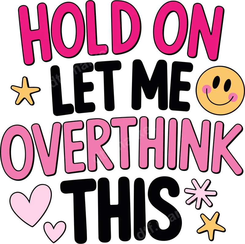 See allThis vibrant DTF transfer features "HOLD ON LET ME OVERTHINK THIS" in a fun, chunky font with hot pink and black letters. Accented with a cheerful smiley face, hearts, and stars, this ready to press design captures a universally understood sentiment with humor and retro flair. Perfect for anyone who embraces their meticulous nature with a smile. This unique heat transfer is ideal for anyone with a playful sense of humor, especially those known for their thoughtful decisions. It makes a fantastic gift for friends, family, or colleagues for birthdays, holidays, or just because. Perfect for personalizing apparel for casual outings, social gatherings, or adding personality to your everyday wardrobe. Applying this apparel transfer is incredibly easy, making custom creation accessible. Our high-quality DTF transfers work seamlessly on cotton, polyester, and blends. For best results, use a heat press at 300-325°F for 15 seconds with medium pressure, then cold peel. This iron on transfer can also be applied with a household iron. Enjoy a ready to press design with no tedious weeding required. Experience professional-grade results with our premium DTF transfers. Each direct to film transfer is engineered for exceptional durability, offering vibrant colors that resist cracking and fading even after multiple washes. The design feels soft to the touch, seamlessly blending with the fabric. Crafted using high-quality DTF film and strong adhesive, this heat press design ensures a long-lasting, professional finish.