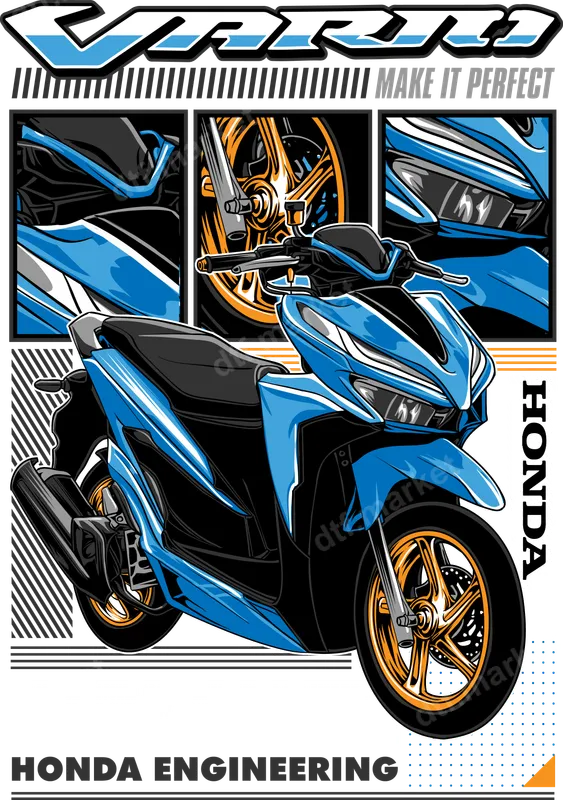 See allThis dynamic DTF transfer showcases a sleek blue Honda Vario scooter, prominently featuring intricate details like its striking orange wheels and the distinctive 'Vario' and 'Honda Engineering' text. With additional panels highlighting close-ups of the headlight, front wheel, and bodywork, this graphic captures the essence of modern street bikes. It’s a ready to press design perfect for customizing your gear with automotive flair. Ideal for motorcycle enthusiasts, scooter riders, and anyone passionate about Honda's engineering prowess or urban street culture. This versatile heat transfer makes an excellent gift for birthdays, Father's Day, or any occasion for the bike lover in your life. Show off your ride with a unique apparel transfer that stands out. Applying this high-quality heat press transfer is simple and efficient. It works beautifully on a wide range of fabrics including cotton, polyester, and various blends. Use a heat press at 300-325°F for 15 seconds with medium pressure. While a heat press is recommended for best results, it can also be an iron on design for smaller applications. Enjoy professional results without the hassle of weeding. Crafted for durability and vividness, our professional-grade DTF film ensures your design remains vibrant, crack-resistant, and soft to the touch, wash after wash. The strong adhesive guarantees a long-lasting finish, making your custom transfer a durable addition to any garment. Elevate your wardrobe with a design that reflects quality and passion.