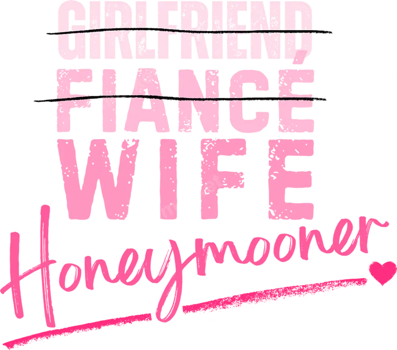 See allCelebrate the beautiful journey from girlfriend to wife and then glorious honeymooner with this charming DTF transfer. Our unique design playfully crosses out "Girlfriend" and "Fiance," emphasizing the joyful "Wife" and "Honeymooner" in a vibrant pink distressed style. This high-quality direct to film transfer is ready to press, perfect for creating memorable personalized apparel. This expressive heat transfer is ideal for new brides, bachelorette parties, bridal showers, or as a thoughtful wedding gift. It’s the perfect iron on decal for honeymoon outfits, announcing your newlywed status with style. Surprise your soon-to-be wife or a cherished friend with a personalized shirt design that commemorates this exciting life chapter. Applying this versatile heat press transfer is incredibly easy on various fabrics like cotton, polyester, and blends. Simply use a heat press at 300-325°F for 15 seconds with medium pressure, then cold peel for best results. While a household iron can be used, a heat press ensures optimal durability. Enjoy professional-looking results without any tedious weeding or complex steps. Expect exceptional quality with our professional-grade apparel transfer. Printed with high-definition inks on durable DTF film, this design delivers vibrant colors and sharp details that resist cracking and fading. The transfer boasts a soft, lightweight feel, integrating seamlessly with your garment. Its strong adhesive ensures your custom transfer remains vibrant and intact through numerous washes, creating a lasting keepsake.