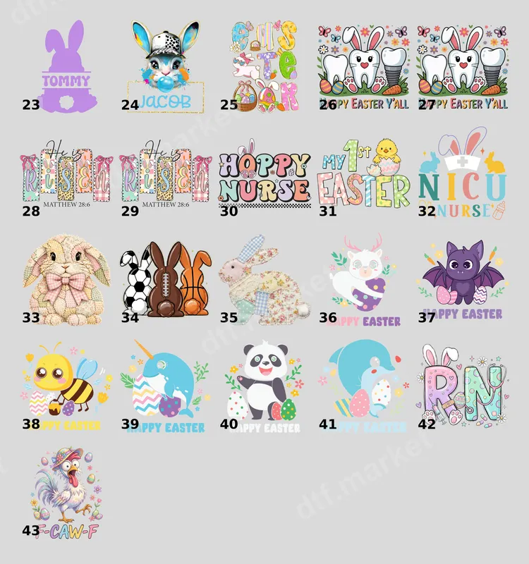 See allThe design features "HOPPY NURSE" in playful, colorful letters with cute bunny ears on the 'H' and a little heart. It's a cheerful and festive direct to film transfer, blending Easter joy with appreciation for healthcare professionals. This ready to press design is perfect for adding a touch of spring and gratitude to any garment. This adorable DTF transfer is ideal for nurses, nursing students, RNs, LPNs, and anyone working in healthcare who loves a bit of holiday cheer. It's perfect for celebrating Easter, Nurses Week, or simply showing everyday appreciation for their hard work. Makes a thoughtful gift for a nursing colleague, friend, or family member, allowing them to create custom t-shirts, bags, or scrubs. Applying this heat transfer is simple and mess-free. Our high-quality DTF transfers work beautifully on a wide range of fabrics, including cotton, polyester, and their blends. For best results, use a heat press at 300-325°F for 15 seconds with medium pressure. It can also be applied with a household iron, making it accessible for everyone. No weeding or complicated steps needed! You'll love the professional quality of this apparel transfer. It boasts vibrant colors, excellent durability, and is designed to be crack-resistant, ensuring your customized items look great wash after wash. The soft-touch finish means it feels comfortable on clothing, and the strong adhesive ensures a lasting bond. Experience premium heat press ready designs from dtf.market.