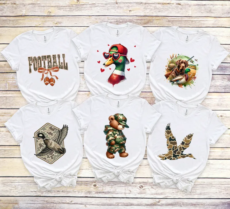 See allImmerse yourself in the spirit of the hunt with this striking DTF transfer featuring a loyal hunting dog, likely a trusty Labrador or retriever, proudly posed alongside a freshly retrieved duck. This detailed design captures the essence of the great outdoors, complete with a classic shotgun and natural marshland elements. It's a high-quality, ready to press design that brings the thrill of hunting straight to your apparel. This rugged heat transfer is perfect for avid hunters, proud dog owners, and anyone who appreciates outdoor sports and wildlife. It makes an exceptional gift for dads, husbands, or friends who love duck hunting, bird hunting, or simply enjoy the companionship of a hunting dog. Ideal for celebrating hunting season, Fathers Day, or adding a personal touch to your everyday outdoor gear. Applying this apparel transfer is effortless. Designed for cotton, polyester, and blend fabrics, it ensures versatility. Simply use a heat press at 300-325°F for 15 seconds with medium pressure, then cold peel the film. No tedious weeding or complicated steps required! For home crafters, a household iron can also be used following careful instructions. Crafted with professional-grade DTF film, this iron on transfer boasts incredibly vibrant colors and sharp details that won't crack or fade over time. The soft-touch finish integrates seamlessly with your garment, offering a professional, durable print that stands up to countless washes. Elevate your wardrobe with this premium hunting-themed t-shirt transfer.