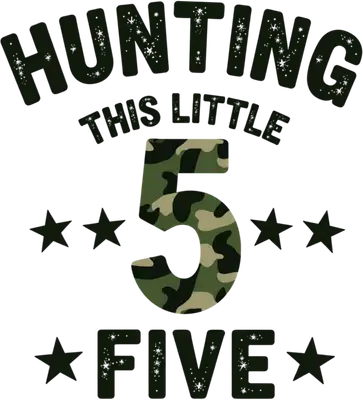 This dynamic DTF transfer proudly declares 'HUNTING THIS LITTLE 5 FIVE', celebrating a child's fifth birthday with a bold, outdoorsy flair. The prominent number '5' is rendered in a classic camouflage pattern in shades of green and brown, surrounded by sharp black stars, while the accompanying text features a speckled, rugged texture. This ready to press design perfectly captures the spirit of a young adventurer ready to explore, making it an ideal choice for any budding hunter or outdoor enthusiast's special day. This unique iron on transfer is perfect for parents, grandparents, or small business owners looking to create special apparel for a little hunter's 5th birthday. Ideal for birthday parties, family gatherings, or just everyday wear for an active child. It makes a fantastic gift for sons, grandsons, nephews, or any child with a love for the outdoors and adventure. Etsy sellers and boutique owners can easily incorporate this heat transfer design into their custom birthday apparel lines, offering unique merchandise for their customers. Applying this heat press transfer is simple and efficient on various fabrics like cotton, polyester, and blends. Use a heat press at 300-325°F for 15 seconds with medium pressure, or a household iron with firm, even pressure. This t-shirt transfer requires no weeding, ensuring a quick and clean application every time. Design custom t-shirts, hoodies, sweatshirts, tote bags, or even baby onesies with ease. For lasting durability, wash garments inside out and tumble dry low. Experience professional results with this high-quality ready to press transfer. Featuring vibrant, full-color printing with exceptional detail, this apparel transfer is crack-resistant and soft to the touch, avoiding the heavy feel of traditional vinyl. Each direct to film transfer is produced on premium DTF film with a strong adhesive backing, ensuring a perfect application and a durable, long-lasting design that holds up through countless adventures.