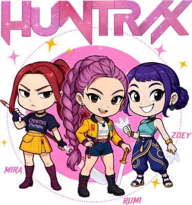 See allEmbrace the spirit of adventure with our captivating HUNTRX chibi anime girl squad design. This vibrant DTF transfer features three uniquely styled warrior girls – Mira, Rumi, and Zoey – each wielding their distinctive weapon with confident expressions. The design is topped with the glittery pink “HUNTRX” logo, all framed by playful sparkles and a dotted pink circle. It's a colorful, energetic, and modern design that's ready to press onto your favorite garments and accessories.