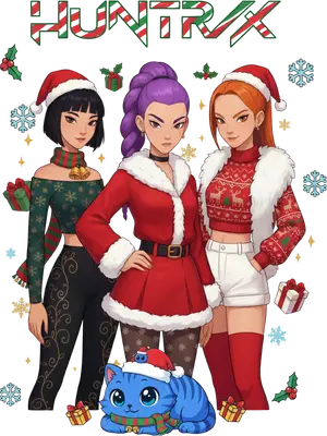 HUNTRX Festive Anime Girls & Blue Cat DTF Transfer | Christmas Ready to Press