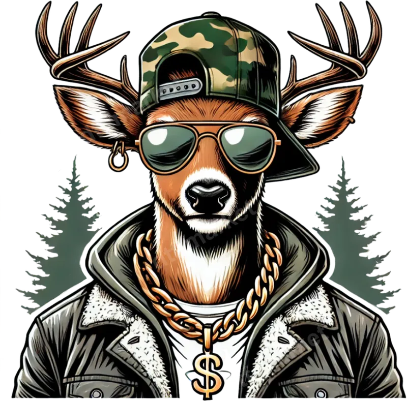Hypebeast Deer DTF Transfer - Camo Hat, Gold Chain, Shades