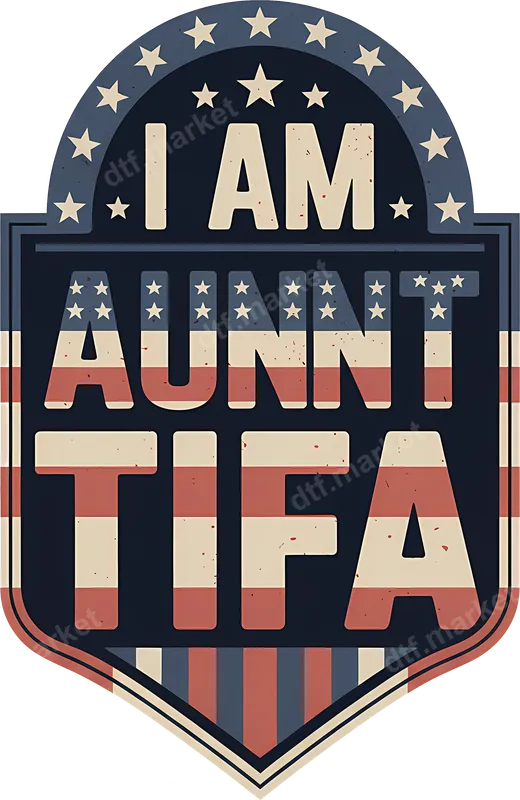 See allThis unique "I Am Aunnt Tifa" DTF transfer features a vintage-style American flag shield design with distressed textures, offering a bold yet humorous statement. The clever wordplay combines a familiar family term with a controversial political group, creating a truly eye-catching and conversation-starting graphic. This high-quality DTF transfer is ready to press onto your favorite apparel, making customization easy and fun. Perfect for those with a sarcastic sense of humor or a penchant for clever political commentary, this design makes an excellent heat press transfer for personalizing everyday wear or creating memorable gifts. Ideal for friends who appreciate edgy humor, political gatherings, casual outings, or simply making a statement. It's a fantastic ready to press transfer for birthdays or just because you want to stir a little fun. Our durable heat press design works flawlessly on a wide range of fabrics, including cotton, polyester, and cotton-poly blends. Applying this iron on transfer is straightforward with a heat press set at 300-325°F for 15 seconds with medium pressure. It can also be applied with a household iron for smaller projects. No tedious weeding required, making it a simple process for crafters of all skill levels. You'll love the professional finish of this apparel transfer. Expect vibrant colors, excellent wash durability, and a soft, flexible feel that won't crack or peel. Each iron on decal is produced using premium DTF film and strong adhesive, ensuring your custom transfer lasts. Elevate your wardrobe or create unique gifts with a professional-grade finish every time.