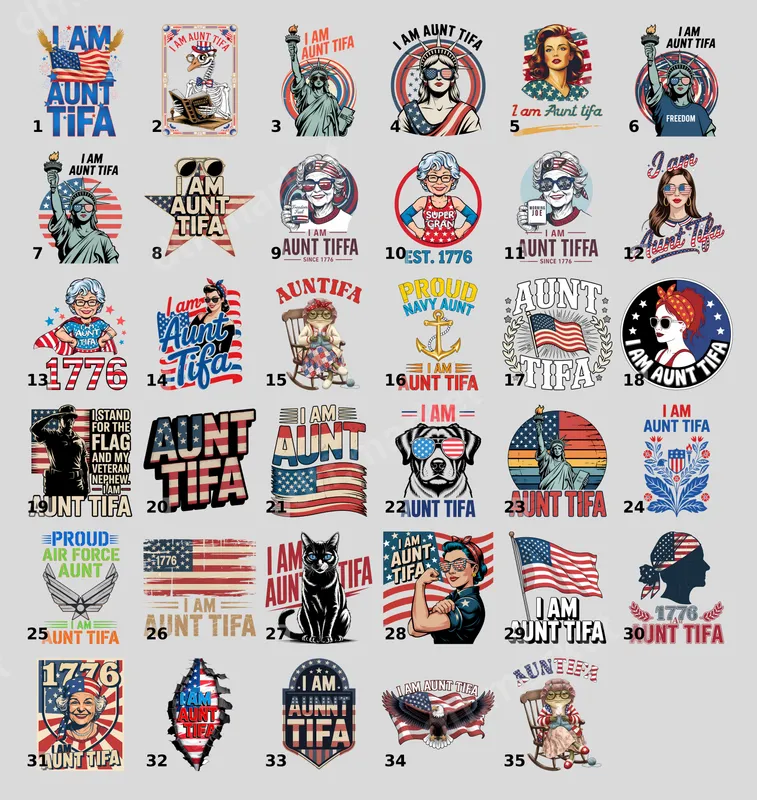 See allMake a bold patriotic statement with our 'I Am Aunt Tifa' DTF transfer. This vibrant heat press design features a majestic bald eagle with outstretched wings, a waving American flag, and dynamic fireworks, all framing the bold declaration. It’s a ready to press transfer that brings a powerful visual message to any garment. This direct to film transfer ensures crisp details and striking colors, making your apparel stand out. This unique apparel transfer is perfect for individuals wanting to express their patriotism with an edgy twist. Ideal for Independence Day celebrations, Memorial Day, political rallies, or everyday wear. It makes a fantastic gift for friends, family, or anyone who appreciates a strong, American-themed statement piece. Customize t-shirts, tank tops, jackets, or tote bags with this eye-catching design. Applying your new 'I Am Aunt Tifa' heat transfer is incredibly easy. Our high-quality iron on transfer works seamlessly on cotton, polyester, and blends. For best results, use a heat press at 300-325°F for 15 seconds with medium pressure. A household iron can also be used with firm, even pressure. Enjoy a professional finish without the need for weeding, making your customization process quick and hassle-free. Experience superior quality with this professionally crafted DTF transfer. Each heat press ready design boasts exceptional vibrancy, ensuring colors remain bright and true wash after wash. The durable film is crack-resistant and incredibly soft to the touch, seamlessly blending with your garment. Our reliable transfer film features a strong adhesive for long-lasting wear, giving you a custom piece of apparel that holds up over time.