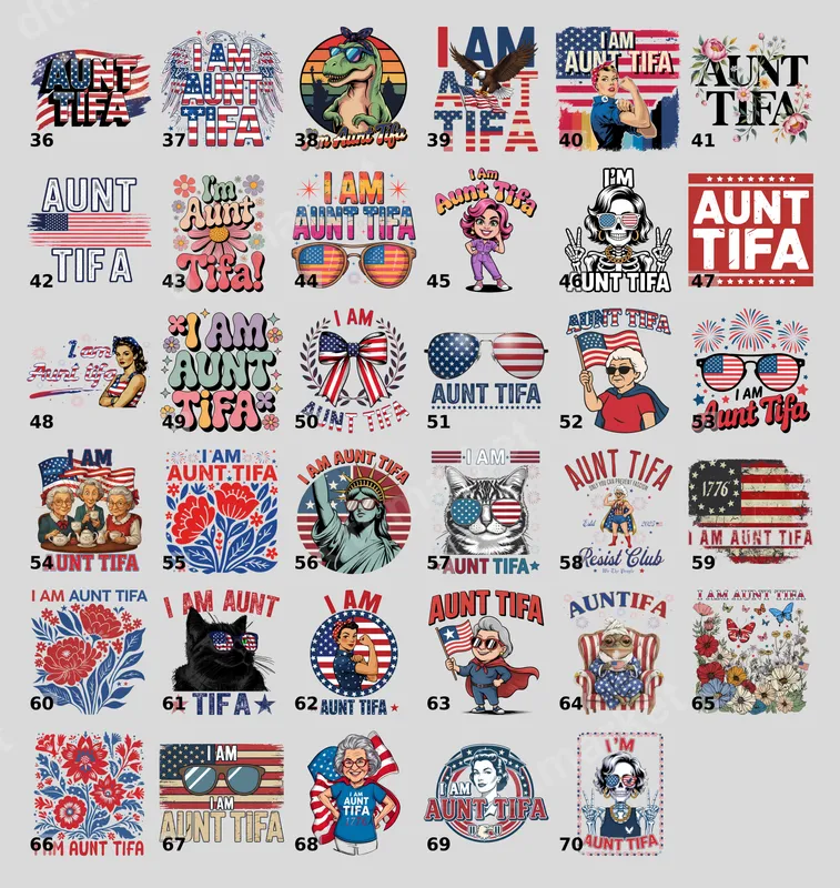 See allThis vibrant DTF transfer proudly features a smiling, patriotic grandma, embodying the spirit of "I Am Aunt Tifa." Dressed in a blue tee and holding an American flag, this design blends humor with a strong statement, portraying a beloved figure ready to stand up for her beliefs. It's a striking and ready to press heat transfer that adds personality to any garment. This unique apparel transfer is perfect for grandmothers, progressive activists, or anyone who identifies with the "Aunt Tifa" movement and wishes to express their stance with wit and patriotism. It makes an excellent gift for Mother's Day, birthdays, or for personalizing everyday wear for social gatherings and community events. Our direct to film transfers are incredibly versatile, adhering beautifully to a wide range of fabrics including cotton, polyester, and their blends. Application is straightforward: use a heat press at 300-325°F for 15 seconds with medium pressure, or apply with a household iron. These iron on decals require no weeding, making customization easy. Experience premium quality with our professional-grade DTF transfers. Designed for durability, they boast vibrant colors that won't crack, peel, or fade, even after multiple washes. The soft-touch finish ensures comfort, while the strong adhesive guarantees a long-lasting, high-quality heat press design that looks fantastic.