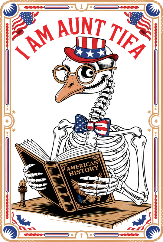 See allThis eye-catching DTF transfer features a patriotic skeleton duck, sporting a stars-and-stripes top hat and bow tie, engrossed in a book titled "AMERICAN HISTORY." Above this scholarly figure, the bold text "I AM AUNT TIFA" delivers a humorous and thought-provoking statement. Framed by a rich, patriotic border, this high-quality, ready to press heat transfer is perfect for making a unique statement. This bold design is ideal for individuals who appreciate satirical humor, political commentary, and a unique take on American patriotism. It's an excellent choice for history enthusiasts, independent thinkers, or anyone looking to add edgy wit to their wardrobe. Perfect for casual wear, political rallies, history club meetings, or as a distinctive gift. It's a fantastic conversation starter for various patriotic occasions. Applying this apparel transfer is incredibly straightforward. Our premium heat press design works flawlessly on a wide array of fabrics, including cotton, polyester, and various blends. For best results, use a heat press at 300-325°F for 15 seconds with medium pressure. A standard household iron can also achieve great results. This iron on decal is truly ready to apply straight out of the package, no weeding required. Experience superior quality with our direct to film transfer. Each design boasts vibrant, true-to-color inks that resist cracking and peeling, ensuring your finished garment looks fantastic wash after wash. The professional-grade DTF film provides a soft, flexible feel on the fabric, maintaining comfort. With a strong adhesive, your new shirt design will securely bond, delivering a durable and long-lasting customized look you'll love.