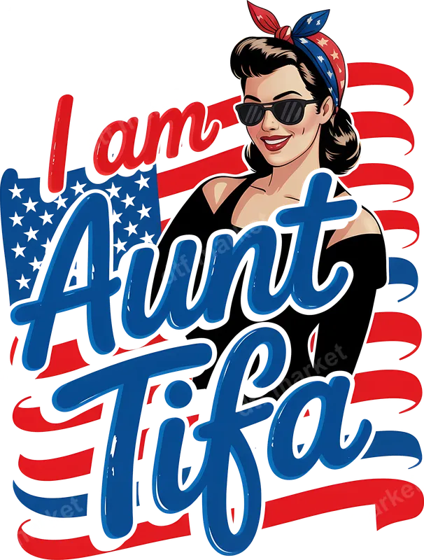 See allThis vibrant "I am Aunt Tifa" DTF transfer features a classic retro pin-up woman, complete with stylish sunglasses and a star-spangled bandana, set against a distressed American flag backdrop. The bold red, white, and blue lettering makes a sassy statement, combining vintage aesthetics with a modern, humorous twist. This high-quality direct to film transfer is ready to press, bringing instant personality and a touch of rebellious charm to any garment. Perfect for individuals who appreciate witty, politically-themed humor, vintage Americana, and a good laugh. This unique heat transfer design is ideal for casual wear, political rallies, 4th of July celebrations, or as a conversation-starting gift for friends and family with a good sense of humor. Show your sarcastic patriotic spirit with this eye-catching apparel transfer that’s sure to get attention. Our premium DTF transfers are incredibly versatile and easy to apply. Simply use a heat press at 300-325°F for 15 seconds with medium pressure, then peel cold. For those without a professional heat press, a household iron can also be used following careful instructions. Unlike traditional vinyl transfer, there's no weeding required, making customization quick and effortless. It adheres beautifully to cotton, polyester, and various fabric blends. Crafted with advanced DTF film technology, this iron on transfer delivers stunningly vibrant colors and exceptional durability. The design is crack-resistant, fade-resistant, and incredibly soft to the touch, ensuring a long-lasting, professional finish. Each heat press ready transfer boasts strong adhesive properties, guaranteeing it will withstand countless washes and wear, maintaining its bold look for years to come.