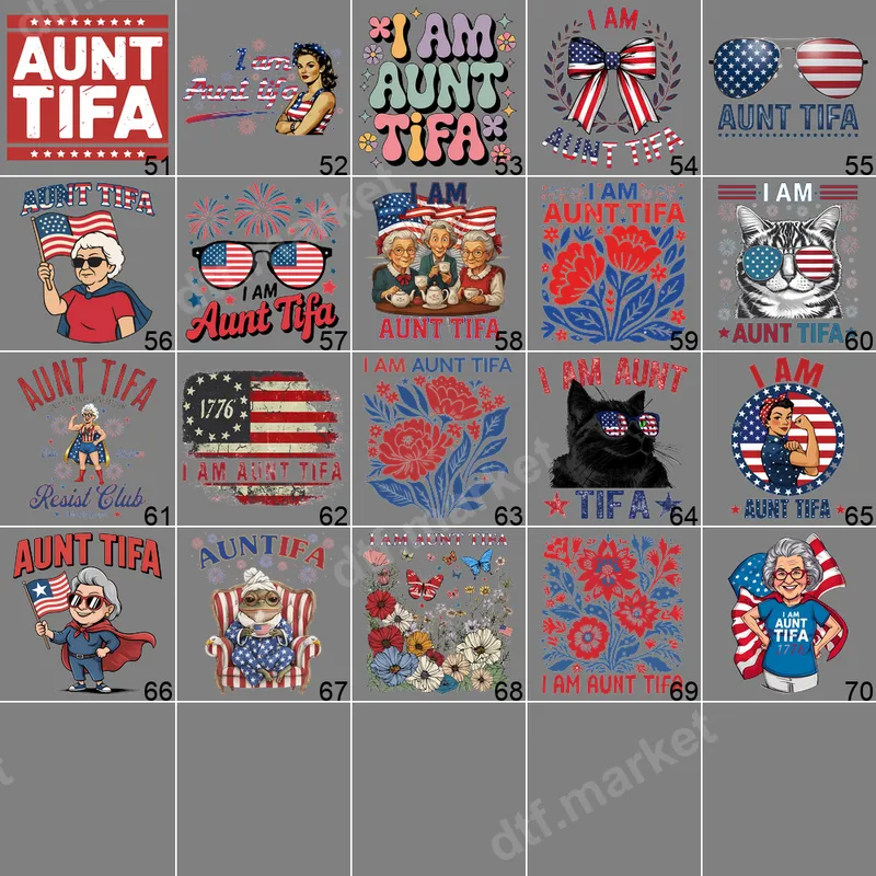 See allThis powerful DTF transfer features a design inspired by Rosie the Riveter, flexing her arm with a patriotic American flag and the bold statement "I AM AUNT TIFA". This graphic blends strength, patriotism, and resistance into a compelling statement. Crafted as a high-quality, ready to press design, it ensures vibrant colors and crisp details to express your convictions effectively. This "I Am Aunt Tifa" heat press transfer is perfect for patriotic, progressive, or activist-minded individuals, especially women and allies demonstrating resilience and civic engagement. It's an excellent choice for Independence Day, political rallies, protests, or daily wear. This design also makes an empowering gift for mothers, grandmothers, sisters, or friends who embody strength and courage. Applying this apparel transfer is straightforward and efficient. Our direct to film transfer adheres beautifully to various fabric types: cotton, polyester, and blends. For optimal results, use a heat press at 300-325°F for 15 seconds with medium pressure. A household iron can also be used. Enjoy hassle-free application with no weeding required; simply press and peel for a perfect finish. Expect superior quality from this durable heat press design. Each t-shirt transfer uses professional-grade DTF film, ensuring vibrant colors, sharp details, and exceptional wash durability. The print resists cracking and peeling, remaining soft to the touch and seamlessly integrated with the fabric. The strong adhesive ensures your design lasts, making it a long-term, impactful addition to custom apparel.