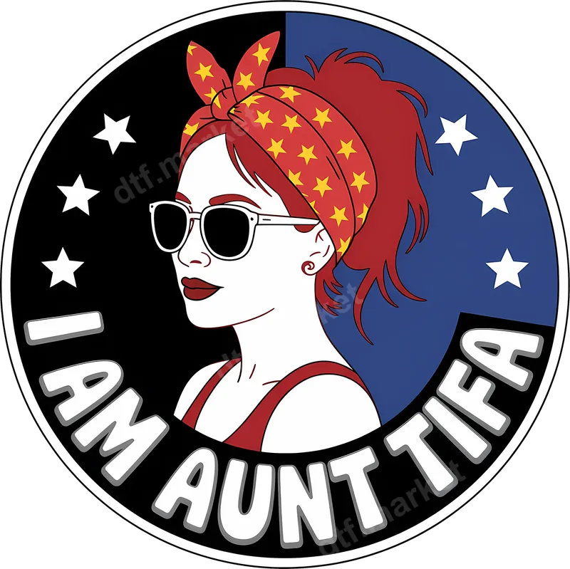 See allUnleash your inner activist with our bold 'I Am Aunt Tifa' DTF transfer. This striking ready to press design features a strong woman in sunglasses and a star-spangled bandana, set against a dynamic red, white, and blue backdrop. Perfect for making a statement, this high-quality direct to film transfer is designed for easy application and lasting impact. This unique heat press transfer is ideal for individuals who champion social justice, express their anti-fascist stance, or simply appreciate a strong, sarcastic political statement. It’s perfect for rallies, protests, casual wear, or as a thoughtful gift for friends and family who share similar values. Stand out at community events or simply infuse your everyday apparel with personality. Our versatile heat transfer is compatible with a wide range of fabrics, including cotton, polyester, and their blends. Application is effortless: use a heat press at 300-325°F for 15 seconds with medium pressure, or apply with a household iron. Unlike traditional vinyl transfers, there's no weeding required, making custom garment creation quick and simple for everyone. Experience professional-grade results with our premium DTF transfers. Each iron on design boasts vibrant, true-to-color imagery that is crack-resistant, peel-resistant, and incredibly soft to the touch. Our specialized DTF film ensures strong adhesion and exceptional durability, so your personalized t-shirt transfer will look fantastic wash after wash, maintaining its powerful message.