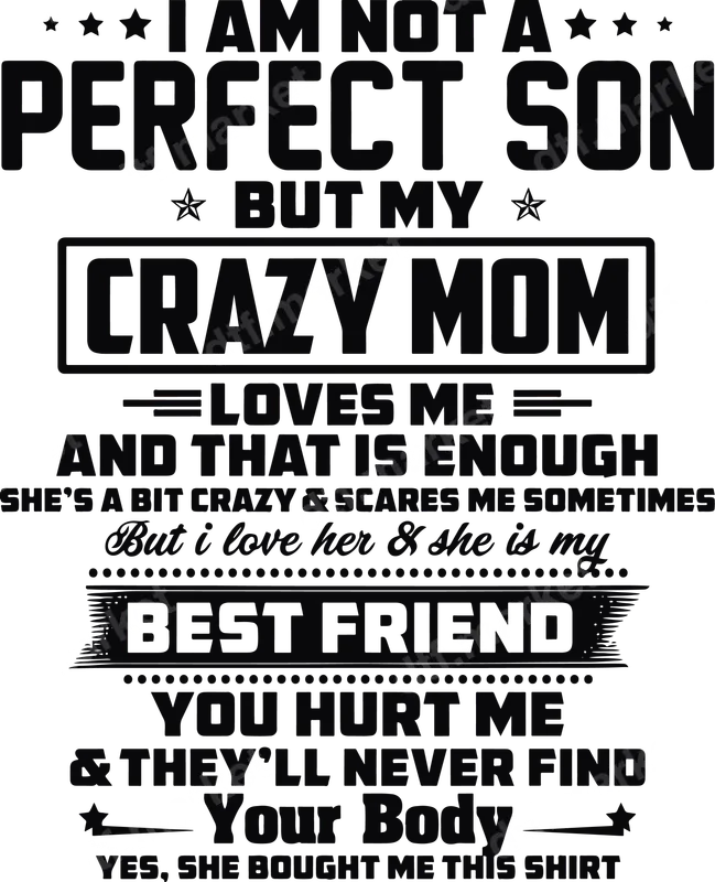 See allThis bold and humorous DTF transfer celebrates the unique bond between a son and his 'Crazy Mom.' The design features a playful yet heartfelt message: 'I Am Not A Perfect Son But My Crazy Mom Loves Me And That Is Enough,' continuing with lines about her protective nature and being his 'Best Friend.' It’s a perfect ready to press transfer for anyone celebrating that special, sometimes wild, mother-son relationship, making a memorable statement with ease and style. Ideal for sons who cherish their moms, or for mothers gifting their sons a shirt that perfectly captures their dynamic, this iron on transfer is excellent for various occasions. Think Mother’s Day, birthdays, Christmas, or as a fun everyday statement. Small business owners will find this a popular heat press design for custom apparel, appealing to customers seeking relatable, funny family themes. It’s a fantastic way to express love and humor. Applying this heat press transfer is incredibly simple. Designed for a smooth, no-weeding process, it requires only a heat press machine set between 300-325°F for 15 seconds. This versatile t-shirt transfer works flawlessly on a wide range of fabrics, including cotton, polyester, and blends, perfect for customizing t-shirts, hoodies, sweatshirts, and tote bags. You can peel it hot or cold, ensuring a quick and professional finish every time. Crafted with premium DTF film and vibrant inks, this ready to press transfer ensures your finished product is visually striking and incredibly durable. Enjoy brilliant colors that resist cracking and fading, maintaining integrity wash after wash. The transfer boasts a soft, lightweight feel that seamlessly integrates with the garment, providing a comfortable and long-lasting apparel transfer.