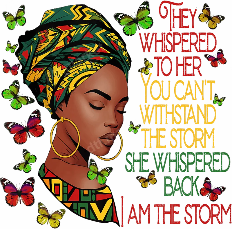 See allEmbrace unwavering strength with this striking "I Am The Storm" DTF transfer. This vibrant design features a beautiful African American woman adorned in a colorful, patterned headwrap and golden hoop earrings, surrounded by fluttering butterflies. The powerful quote, "They whispered to her, 'You can't withstand the storm.' She whispered back, 'I AM THE STORM'," is prominently displayed in bold, multi-colored typography. It's a perfect ready to press design for anyone looking to make a statement of resilience and self-belief. This inspirational design is ideal for strong women, advocates for empowerment, and anyone who has overcome adversity. It makes a fantastic gift for birthdays, Mother's Day, Juneteenth, or as a thoughtful gesture for a friend needing a boost of confidence. Use this powerful heat transfer to customize apparel for rallies, community events, or simply to express your inner strength daily. Applying this ready-to-press iron on transfer is simple and efficient. For best results, use a heat press at 300-325°F for 15 seconds with medium, even pressure. This versatile design works perfectly on cotton, polyester, and most fabric blends. Enjoy a professional finish without the hassle of weeding or layering, saving you time and effort. Experience superior quality with this premium DTF transfer. Our professional-grade film ensures your t-shirt transfer boasts vibrant colors that pop, exceptional durability, and resistance to cracking or fading even after multiple washes. The soft-touch finish integrates seamlessly with your garment, providing a comfortable feel and a long-lasting, high-definition design that truly stands out.