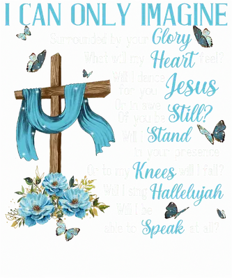 See allThis inspiring DTF transfer features a wooden cross draped with flowing blue fabric, adorned with serene blue florals and delicate butterflies. It elegantly displays the beloved lyrics 'I Can Only Imagine', with key words like 'Glory,' 'Jesus,' 'Stand,' and 'Hallelujah' highlighted. This ready to press design evokes a powerful sense of worship and spiritual reflection, making it a perfect statement of faith. This uplifting design is perfect for devoted Christians, church groups, or anyone seeking faith-based inspiration. It makes a thoughtful iron on transfer gift for baptisms, Easter, confirmations, or as a comforting gesture for a loved one. Small businesses and crafters specializing in Christian apparel will find this heat transfer design an ideal addition, creating meaningful garments that resonate deeply. Applying this heat press transfer is simple, adhering flawlessly to cotton, polyester, blends, and even nylon. Achieve professional results with a heat press (300-325°F, 15 seconds, medium pressure) or a household iron. No weeding required – just peel and press! Create stunning custom t-shirts, hoodies, tote bags, pillow covers, and baby onesies. Wash inside out, tumble dry low for long-lasting vibrancy. Our ready to press transfer ensures exceptional quality with vibrant, full-color printing and crisp details. Enjoy a crack-resistant finish that feels soft, without the heavy, stiff feel of vinyl. Each direct to film transfer is meticulously printed on premium DTF film, featuring a strong adhesive backing for reliable, professional applications every time, ensuring your message of faith shines brightly.