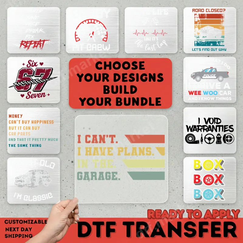 See allThe "I Can't I Have Plans In The Garage" DTF transfer perfectly captures the spirit of car enthusiasts and DIY mechanics. Featuring a distressed, retro-inspired font and a classic color palette, this ready to press design is ideal for anyone whose second home is their workshop. It's a statement piece that speaks volumes, making it a fantastic addition to any gearhead's collection. This high-quality direct to film transfer ensures easy application and lasting vibrancy. This unique heat transfer is perfect for mechanics, car show attendees, auto enthusiasts, and anyone who cherishes their garage time. It makes an excellent gift for Father's Day, birthdays, or just because, for the dad, husband, or friend who lives for their projects. Imagine this cool iron on decal on a work shirt, a casual tee for weekend projects, or a personalized gift for a fellow car lover. Applying your new shirt design is a breeze! Our apparel transfers are compatible with all fabric types, including cotton, polyester, and various blends. For best results, use a heat press at 300-325°F for 15 seconds with medium pressure, then peel cold. Forget about weeding vinyl transfer designs; our DTF transfers are ready to press directly onto your garment right out of the package. Experience professional-grade quality with every print. Our DTF transfers boast vibrant colors, superior crack resistance, and a soft, smooth feel. Crafted using premium direct to film technology and strong adhesive, these heat press designs ensure a durable finish that withstands countless washes without fading or peeling. Elevate your apparel with a custom transfer that looks fantastic and truly lasts.