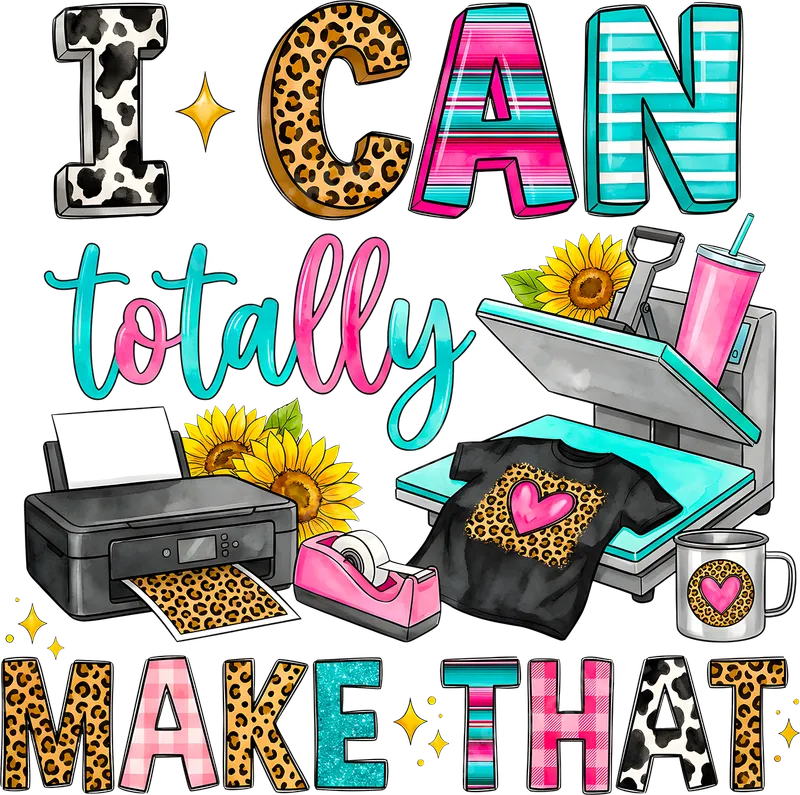 See allThis lively DTF transfer proudly declares "I CAN totally MAKE THAT" in a fun, mixed-pattern typography style. Featuring popular prints like cowhide, leopard, serape, and glitter, alongside playful elements such as a DTF printer, heat press, and sunflowers, this design is a vibrant celebration of creativity and the DIY spirit. It’s a ready to press heat press design. This versatile iron on transfer is perfect for the avid crafter, DIY enthusiast, or small business owner who loves to create personalized items. It's an ideal shirt design for craft fair vendors, boutique owners, or anyone adding handmade charm to their wardrobe or gifts. Great for crafting events, workshops, or as a thoughtful present for a fellow maker, this graphic embodies a confident and creative attitude. Applying your new apparel transfer is simple and efficient. This heat transfer works beautifully on 100% cotton, polyester, and various cotton/poly blends, making it incredibly versatile for all your garment projects. For best results, use a heat press at 300-325°F for 15 seconds with medium pressure, then perform a warm peel. There's no weeding required, saving you time and effort. Our premium DTF transfers are crafted to deliver exceptional quality. You'll experience vibrant colors, excellent wash durability, and a soft, lightweight feel that won't crack or peel. Each direct to film transfer is printed on professional-grade film with strong, reliable adhesive, ensuring your custom transfer looks fantastic and lasts, bringing your DIY visions to life with professional results.