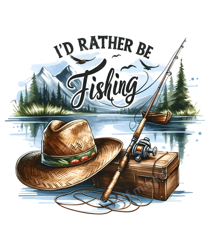 See allThis captivating DTF transfer features the phrase 'I'D RATHER BE Fishing' in a stylish font mix. The design portrays a serene mountain lake scene with a rustic straw hat, a fishing rod, and a vintage tackle box. Majestic mountains, evergreen trees, and soaring birds complete this idyllic background. This ready to press design perfectly captures the peaceful allure of the great outdoors and the angler's passion. This versatile heat press transfer is perfect for fishing enthusiasts, seasoned anglers, and nature lovers. It’s an excellent choice for custom apparel for outdoor adventures, lake house gatherings, or just showcasing a cherished hobby. It makes a fantastic gift for Father's Day, birthdays, Christmas, or retirement, appealing to dads, grandpas, uncles, and friends who live for the next big catch. Applying this apparel transfer is easy and works flawlessly on cotton, polyester, and blends. For best results, use a heat press at 300-325°F for 15 seconds with medium pressure, then cool peel. A household iron can also be used; instructions provided. This iron on decal offers hassle-free application – no weeding or layering, just a professional-looking shirt design ready in minutes. Our premium direct to film transfers boast exceptional durability and vibrant colors. Each transfer is crack-resistant, fade-resistant, and surprisingly soft to the touch, ensuring long-lasting comfort. We use high-quality DTF film with a robust adhesive, engineered to bond perfectly with your garment. Trust dtf.market for a superior heat press ready experience that will make your custom creations stand out.