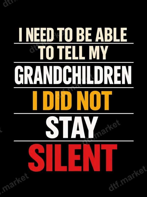See allThis impactful DTF transfer features the bold, multi-colored statement, "I NEED TO BE ABLE TO TELL MY GRANDCHILDREN I DID NOT STAY SILENT." With its clear, assertive typography in white, gold, and red against a black background, this design is perfect for those who are committed to making their voices heard. It's a powerful and ready to press design, ensuring your message stands out clearly and professionally. This design is ideal for activists, community organizers, concerned citizens, parents, and grandparents who want to inspire change and leave a legacy of courage for future generations. It’s a perfect addition to protest attire, awareness campaigns, or as a meaningful gift for someone passionate about social or political issues. Wear it to rallies, civic meetings, or as an everyday statement of conviction. Our premium direct to film transfers are incredibly versatile and simple to apply. They work flawlessly on a wide range of fabrics, including 100% cotton, polyester, and various cotton-poly blends. Apply this high-quality heat transfer effortlessly with a heat press set between 280-300°F for 6-10 seconds with medium pressure, followed by an instant peel. No complicated weeding or layering like traditional vinyl transfers; just press and go! You can even use a household iron for smaller projects. Experience the exceptional quality of our apparel transfers. Each design boasts vibrant, true-to-color inks that are crack-resistant and incredibly soft to the touch, feeling like part of the fabric itself. Our professional DTF film ensures strong adhesion and long-lasting durability, wash after wash. Invest in a durable, striking iron on transfer that will continue to inspire for years to come.