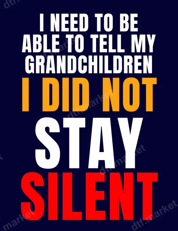 See allMake a bold statement with our 'I Did Not Stay Silent' DTF transfer, featuring impactful white, orange, and red typography against a dark background. This powerful design encourages standing up for beliefs and ensures your voice is heard for generations to come. It’s a compelling ready to press transfer that speaks volumes without you having to say a word. This design is perfect for activists, concerned citizens, and anyone who wants to convey a strong message about accountability and speaking out. It makes an excellent gift for grandparents, parents, or friends who are passionate about social or political issues and want to leave a legacy of courage. Wear it to rallies, community events, or as an everyday expression of your convictions. Our premium direct to film transfer is incredibly easy to apply. Simply use a heat press at 280-300°F for 6-10 seconds with medium pressure, then instantly peel for a flawless finish. It adheres beautifully to cotton, polyester, and most fabric blends. For convenience, a household iron can also be used, making it an accessible option for everyone. Best of all, there’s no weeding or intricate alignment required, saving you time and effort. Crafted using high-quality DTF film and vibrant, durable inks, this apparel transfer is designed to withstand countless washes without cracking or fading. The transfer maintains a soft, flexible feel on your garment, ensuring comfort alongside its powerful message. Get your heat press ready design and wear your stance with pride, creating custom t-shirts and more that truly resonate.