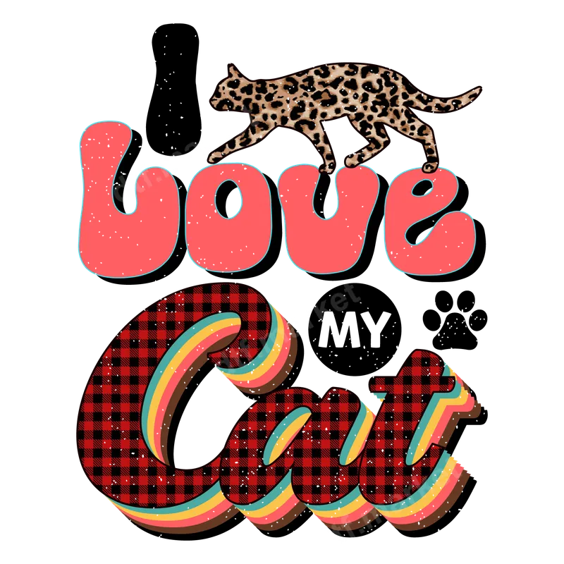 See allThis eye-catching DTF transfer proudly declares "I Love My Cat" with a unique blend of styles. The word "love" is rendered in a playful, distressed coral font with a teal outline, while a sleek leopard print cat struts gracefully above. The word "Cat" stands out in a bold, distressed red and black buffalo plaid pattern, complete with retro-inspired layered shadows in warm, earthy tones. This ready to press design also includes a cute paw print, making it perfect for any feline enthusiast. Ideal for cat moms, pet owners, and animal lovers, this versatile heat transfer makes a fantastic gift for birthdays, Mother's Day, or just because. Show off your purr-fect devotion to your furry friend on casual outings, pet adoption events, or simply enjoying cozy days at home. It’s a charming way to personalize garments and accessories for yourself or to delight a fellow cat aficionado. Applying this vibrant t-shirt transfer is simple and mess-free. Designed for a professional finish, it adheres beautifully to a wide range of fabrics including cotton, polyester, and blends. Use a heat press at 300-325°F for 15 seconds with medium pressure, then cold peel for optimal results. No tedious weeding or intricate layering required, making it a quick and easy way to customize your apparel. You can even use a household iron for smaller applications, following similar temperature guidelines. Our high-quality DTF film ensures your iron on transfer is not only visually stunning but also incredibly durable. Enjoy vibrant colors that pop, a soft hand feel that blends seamlessly with the fabric, and a crack-resistant finish that withstands countless washes. This professional-grade apparel transfer offers strong adhesion and long-lasting wear, ensuring your beloved cat design stays looking fresh.