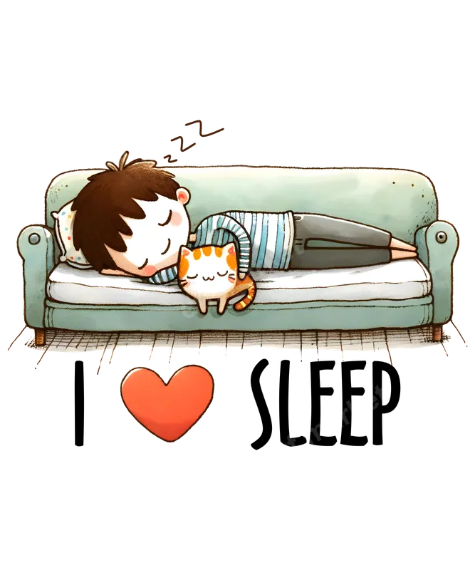 I Love Sleep DTF Transfer with Cute Cat & Boy on Sofa