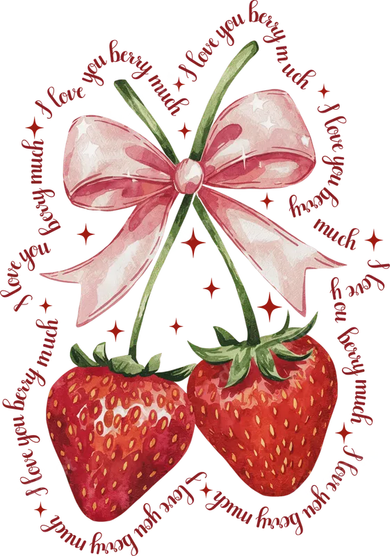 See allThis charming DTF transfer features a delightful watercolor illustration of two ripe strawberries, lovingly tied together with a soft pink bow. Encircling the sweet berries is the playful pun, "I love you berry much," rendered in an elegant cursive script with twinkling star accents. This ready to press design exudes a tender, romantic, and whimsical vibe, perfect for anyone looking to add a touch of heartfelt sweetness to their apparel. It's an instant way to create custom clothing. Ideal for expressing affection, this heat press transfer is perfect for couples, sweethearts, or anyone celebrating love. It makes an excellent iron on for Valentine's Day outfits, anniversary gifts, engagement celebrations, or just because. Surprise your significant other, a dear friend, or even a cherished family member with a unique, handmade garment that truly says "I love you berry much." It’s also a fantastic choice for crafters looking for adorable shirt designs. Our high-quality heat transfer works beautifully on a wide range of materials, including cotton, polyester, and various fabric blends. Applying this iron on decal is simple: use a heat press at 300-325°F for 15 seconds with medium pressure, or follow instructions for a household iron. Forget the hassle of weeding vinyl transfers; this direct to film transfer is cut to perfection and ready to apply straight out of the package, ensuring a smooth and easy customization process. Expect nothing less than professional-grade results with this durable apparel transfer. The colors are vibrant and true to the watercolor artistry, ensuring your design stands out. Our DTF transfers are engineered to be crack-resistant, incredibly soft to the touch, and built to withstand countless washes without fading or peeling. Each transfer is produced using premium DTF film and strong adhesive, guaranteeing a long-lasting and high-quality finish for your custom creations.