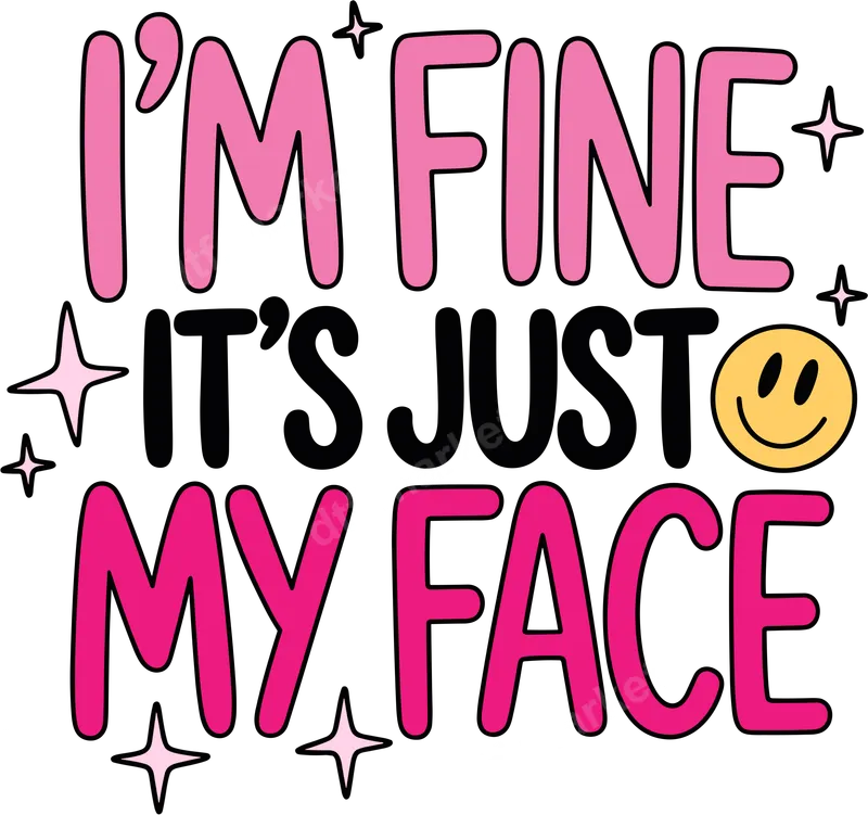 See allThis vibrant DTF transfer features the relatable phrase "I'M FINE IT'S JUST MY FACE" in playful pink and black lettering, accented by a classic yellow smiley face and sparkling stars. It's the perfect ready to press design for anyone who's mastered looking a certain way, regardless of their actual mood. This humorous graphic captures a universally understood sentiment with a sassy, lighthearted vibe, making it an instant conversation starter for custom apparel. This funny heat transfer is ideal for anyone with a dry wit, a love for sarcasm, or a perpetually unimpressed facial expression. It makes a fantastic gift for friends, family, or yourself, celebrating birthdays, casual get-togethers, or just everyday wear. Perfect for those who appreciate a good chuckle and aren't afraid to show their 'resting face' to the world, this design is a playful addition to any wardrobe. Applying this ready to press transfer is incredibly simple, ensuring a professional finish every time. It adheres beautifully to a wide range of fabrics, including cotton, polyester, and various blends, making it versatile for many projects. For best results, use a heat press at 300-325°F for 15 seconds with medium pressure, then perform a cool peel. Unlike traditional vinyl transfers, there's no weeding required, saving you time and effort. Our premium DTF transfers are crafted using high-quality film and inks, ensuring exceptional durability and a vibrant, crisp image that won't crack, peel, or fade. The resulting design is incredibly soft to the touch, seamlessly blending with the fabric for maximum comfort. This professional apparel transfer boasts strong adhesive properties, guaranteeing a long-lasting application that stands up to countless washes, keeping your humor fresh.