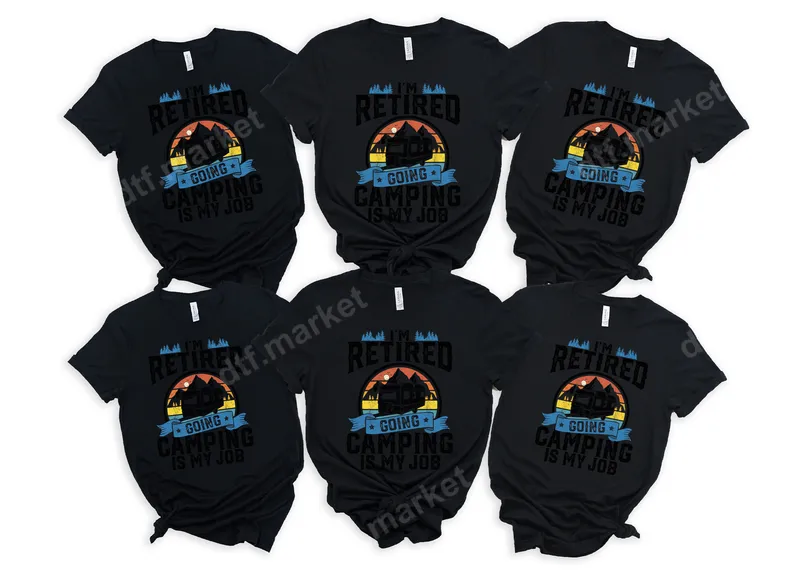 See allThis vibrant DTF transfer features the playful phrase "I'm Retired Going Camping Is My Job" centered around a picturesque camping scene. The design showcases an RV or camper nestled amongst mountains and trees, silhouetted against a warm, multi-colored sunset or sunrise. With its distressed, vintage-inspired aesthetic and bold typography, this ready to press transfer captures the relaxed and adventurous spirit of retirement. It's an ideal choice for anyone looking to celebrate their newfound freedom with a touch of outdoor charm. This unique heat transfer design is perfect for recent retirees, seasoned campers, RV enthusiasts, and anyone who dreams of endless road trips and nights under the stars. It makes a fantastic gift for Father's Day, Mother's Day, birthdays, retirement parties, or simply as a treat for yourself. Imagine creating matching shirts for a family camping trip, or a personalized hoodie for a grandparent embarking on their retirement adventures. Applying this apparel transfer is incredibly easy, making it accessible for both beginners and experienced crafters. Our high-quality heat press design works flawlessly on a wide range of fabrics, including cotton, polyester, and various blends. For best results, use a heat press at 300-325°F for 15 seconds with medium pressure. Unlike traditional vinyl transfer, there's no weeding required, saving you time and effort. You can even apply it with a household iron for smaller projects. Experience professional-grade results with our premium DTF transfers. Each iron on transfer boasts vibrant colors that pop, exceptional durability, and a soft, lightweight feel that won't crack or peel. Crafted using professional direct to film transfer technology and strong adhesive, your designs will withstand countless washes, maintaining their crisp look and integrity. Elevate your custom apparel projects with a transfer that truly lasts.