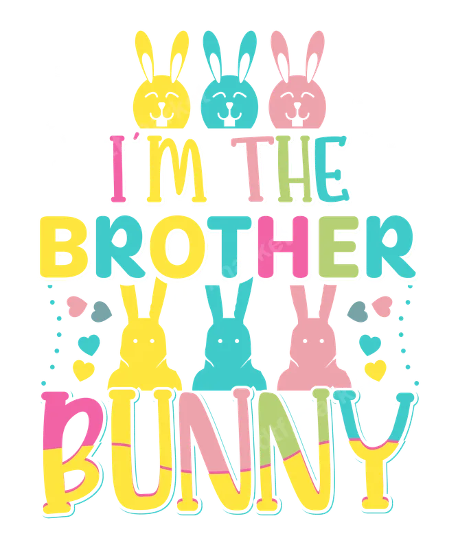 See allThis cheerful DTF transfer features the playful phrase "I'M THE BROTHER BUNNY" in a vibrant, multi-colored font. Adorned with charming bunny illustrations in pastel yellow, teal, and pink, along with scattered hearts, this design captures the joyful spirit of spring and Easter. It's a fantastic ready to press transfer, making it easy to create custom apparel with a professional finish. Perfect for any proud brother celebrating Easter, this heat press design is ideal for family gatherings, egg hunts, or as a fun everyday outfit during the spring season. It makes a delightful gift for sons, nephews, or grandsons to wear for holiday photos or simply to show off their special "Brother Bunny" status. This design is also great for small businesses creating seasonal apparel for kids. Our high-quality heat transfer is versatile and suitable for a wide range of fabrics, including cotton, polyester, and blends. Application is straightforward: simply use a heat press at 300-325°F for 15 seconds with medium pressure. For those without a professional press, a household iron can also achieve great results. Best of all, these iron on transfers require no weeding, saving you time and effort. Crafted using premium DTF film, this direct to film transfer boasts incredibly vibrant colors and sharp details that truly pop. The design is engineered to be crack-resistant and soft to the touch, ensuring comfort and durability wash after wash. The strong adhesive ensures a long-lasting bond to your garment, making your custom shirt design look fantastic for seasons to come.