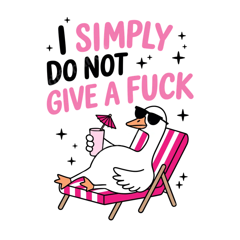 See allThis playful DTF transfer features a laid-back goose in sunglasses, lounging in a pink beach chair with a tropical drink. The bold text "I Simply Do Not Give A F*ck" with sparkling accents perfectly embodies a carefree, unbothered attitude. This high-quality direct to film transfer is a witty statement, ready to press onto your favorite apparel for instant personality. Ideal for those with a sarcastic sense of humor or friends who embrace a chill vibe, this funny heat press design makes a fantastic gift. Think birthdays, bachelorette parties, or simply a treat for yourself. Perfect for casual wear or vacation outfits, this iron on decal adds an irreverent touch to any wardrobe. Applying this ready to press transfer is straightforward for everyone. It adheres beautifully to cotton, polyester, and blends. For best results, use a heat press at 300-325°F for 15 seconds with medium pressure. A household iron can also be used. No tedious weeding or layering required; simply press and enjoy your custom shirt design! Our direct to film transfers boast exceptional quality, ensuring vibrant colors that maintain integrity wash after wash. The durable print is crack-resistant and offers a remarkably soft feel, blending seamlessly with the fabric. Crafted with professional-grade DTF film and a strong adhesive, this t-shirt transfer guarantees a lasting, high-quality finish.