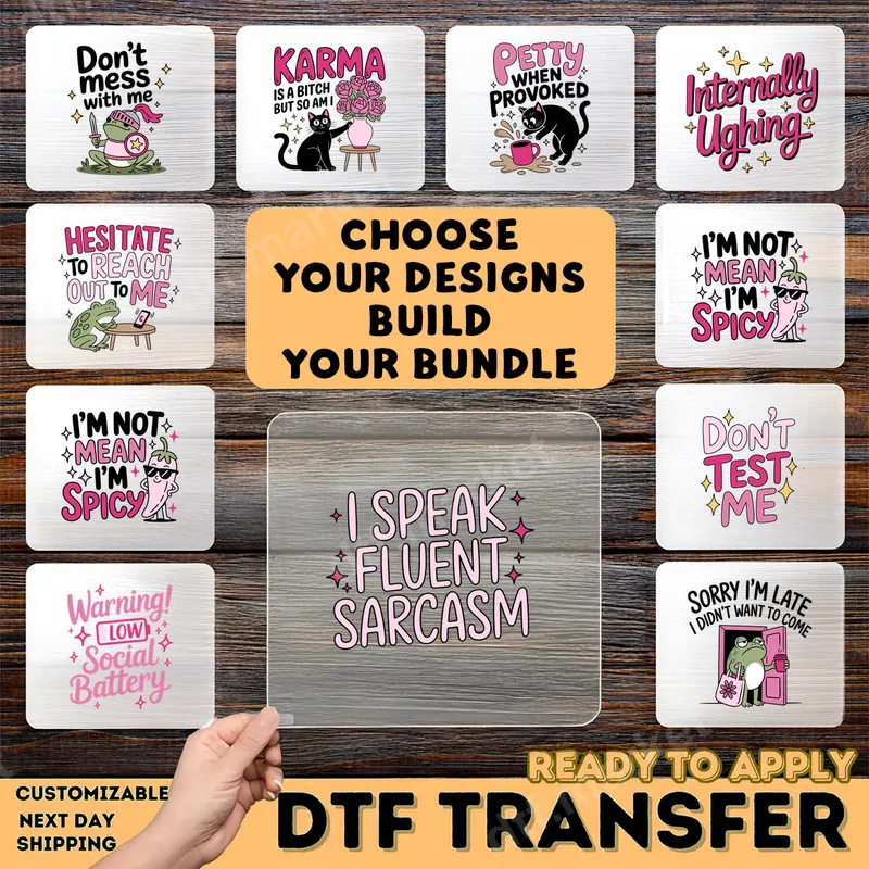See allExpress your clever wit with our 'I Speak Fluent Sarcasm' DTF transfer. This vibrant heat press design features playful pink lettering adorned with sparkling accents, creating a fun and bold statement piece. It’s the perfect ready to press transfer for anyone who masters the art of sarcasm and isn’t afraid to show it. This high-quality direct to film transfer offers a professional finish, making your custom apparel truly stand out. This sassy iron on transfer is ideal for individuals with a sharp sense of humor, friends who love a good joke, or anyone looking to add some personality to their wardrobe. Great for everyday wear, casual outings, social events, or as a hilarious gift for birthdays, holidays, or just because. Imagine this unique t-shirt transfer on your favorite tee, making everyone smile (or perhaps ponder your meaning!). It's also a fantastic addition to a crafter's collection for creating custom gifts. Applying this heat press ready design is quick and easy. Our DTF transfers work beautifully on a wide variety of materials, including cotton, polyester, and their blends. Simply use a heat press at 300-325°F for 15 seconds with medium pressure. Even a household iron can achieve great results by ensuring even pressure and temperature. There's absolutely no weeding required, saving you time and effort to get your custom shirt design ready faster. Experience superior quality with our durable DTF transfer. Each apparel transfer boasts vibrant, crisp colors that remain crack-resistant and soft to the touch, wash after wash. We use professional-grade DTF film and strong adhesive to ensure your design adheres perfectly and lasts for a long time. Create long-lasting, professional-looking custom garments without the hassle of traditional vinyl transfer methods.