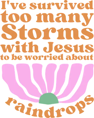 This vibrant DTF transfer features a powerful, inspirational message: "I've survived too many Storms with Jesus to be worried about raindrops." The design combines bold, retro-style typography in warm orange tones with a charming pink and teal floral graphic, creating a comforting yet stylish look. It's a perfect ready to press statement piece for anyone seeking encouragement or wanting to share their faith. This design is ideal for Christian women, youth group members, and anyone who draws strength from their faith. It makes a thoughtful gift for friends or family navigating difficult times, or as an empowering self-purchase. Small t-shirt businesses and crafters will find this iron on transfer a popular choice for creating unique apparel for spiritual retreats, church events, or everyday inspirational wear. Applying this heat press transfer is simple and efficient, making it perfect for custom t-shirts, hoodies, tote bags, and even denim jackets. It works beautifully on cotton, polyester, and blends, with application recommended at 300-325°F for 15 seconds with medium pressure. No tedious weeding is required – just peel and press! For long-lasting results, wash garments inside out and tumble dry low. Experience professional quality with this ready to press transfer. Our direct to film transfer technology ensures vibrant, full-color printing with crisp details and excellent durability. The finish is crack-resistant, soft to the touch, and avoids the heavy, stiff feel of traditional vinyl. Each apparel transfer is printed on premium DTF film, providing a strong adhesive for a flawless application every time.