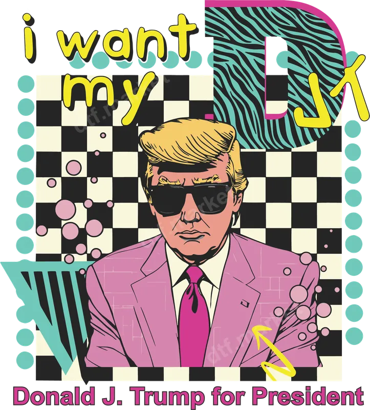 See allDive into nostalgia with our "I Want My DJT" Donald Trump DTF transfer, blending iconic 90s aesthetics with a clear political statement. This eye-catching design features a pop-art style depiction of Donald J. Trump in a vibrant pink suit and sunglasses, set against a bold checkerboard background, complete with teal zebra print accents and neon colors. It's a ready to press heat transfer, perfect for supporters looking to express their views with a unique, retro flair. This distinctive design is ideal for Trump supporters, political enthusiasts, and anyone who appreciates bold, retro-inspired graphics. It makes a fantastic statement piece for rallies, political events, or casual wear, allowing you to proudly display your choice for president. It’s also a unique gift idea for friends and family during election seasons, birthdays, or any occasion desiring a strong political message with a fun, vintage twist. Our direct to film transfer is incredibly easy to apply, ensuring a professional finish every time. Simply use a heat press at 280-300°F for 6-10 seconds with medium pressure, then perform an instant, hot peel. For those without a heat press, a household iron can also be used. This durable iron on decal adheres seamlessly to cotton, polyester, and most fabric blends, providing a smooth finish without any tedious weeding required. Experience superior quality with our premium DTF transfers. These t-shirt transfers boast incredibly vibrant, crack-resistant colors that pop, integrating beautifully with the fabric for long-lasting durability wash after wash. Each heat press design is made using professional-grade DTF film with a strong, reliable adhesive, guaranteeing a high-quality print that feels soft and will last.