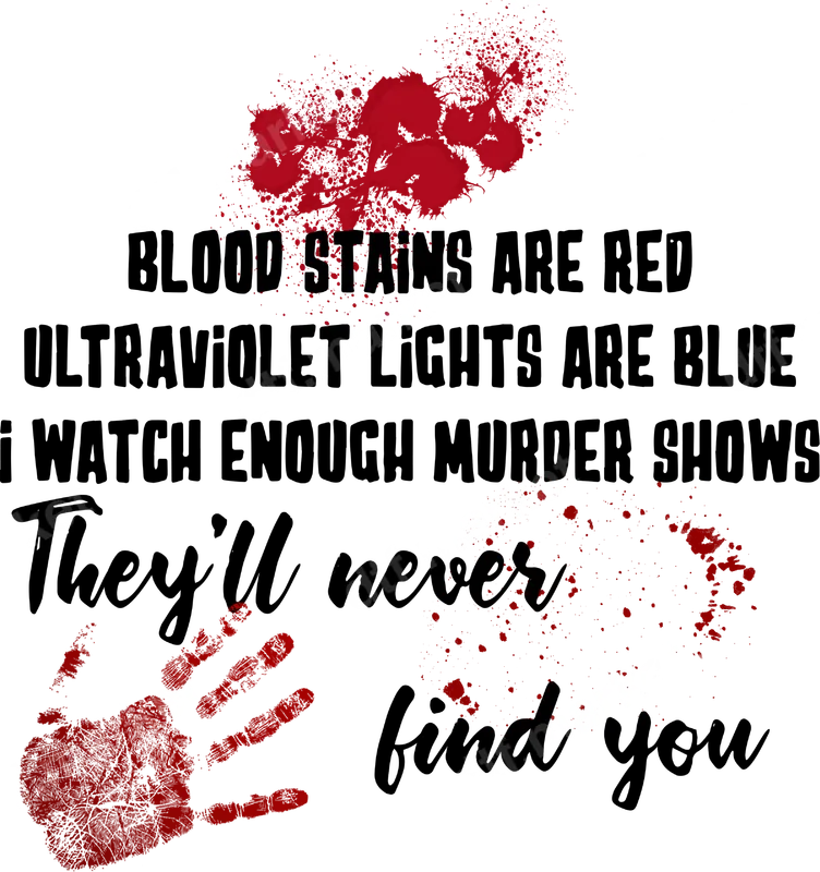 See allUnleash your inner detective with our "I Watch Enough Murder Shows" DTF transfer. This striking design combines dark humor with a macabre aesthetic, featuring the clever poem: "Blood Stains Are Red, Ultraviolet Lights Are Blue, I Watch Enough Murder Shows, They'll Never Find You." Accented with realistic blood spatters and a chilling bloody handprint, it's the perfect statement piece for true crime aficionados. This premium DTF transfer is ready to press, ensuring vibrant colors and a professional finish on any garment. This unique design is tailored for the true crime enthusiast, the podcast binger, and anyone who appreciates a touch of dark humor. It makes an excellent gift for friends who are obsessed with forensic shows, mystery novels, or unsolved cases. Whether you're attending a Halloween party, a themed gathering, or just expressing your passion for the macabre, this eye-catching iron on transfer is sure to spark conversations and knowing smiles. Applying your new design is incredibly easy! This heat press transfer requires no weeding, saving you time and effort. Simply apply it using a heat press at 300-325°F for 15 seconds, peel cold, and press again for 5 seconds for a perfect finish. It adheres beautifully to a wide range of fabrics including cotton, polyester, and blends, making it a versatile choice for your custom apparel projects. Transform your favorite t-shirts, hoodies, and tote bags effortlessly. Our direct to film transfer technology ensures a high-quality, durable result. Enjoy crisp details, vibrant colors, and a soft touch that feels great against the skin. This premium heat press ready design is crack-resistant, fade-resistant, and built to last through countless washes. Elevate your wardrobe with a truly unique and professional t-shirt transfer that reflects your individual style and fascination with the mysterious.