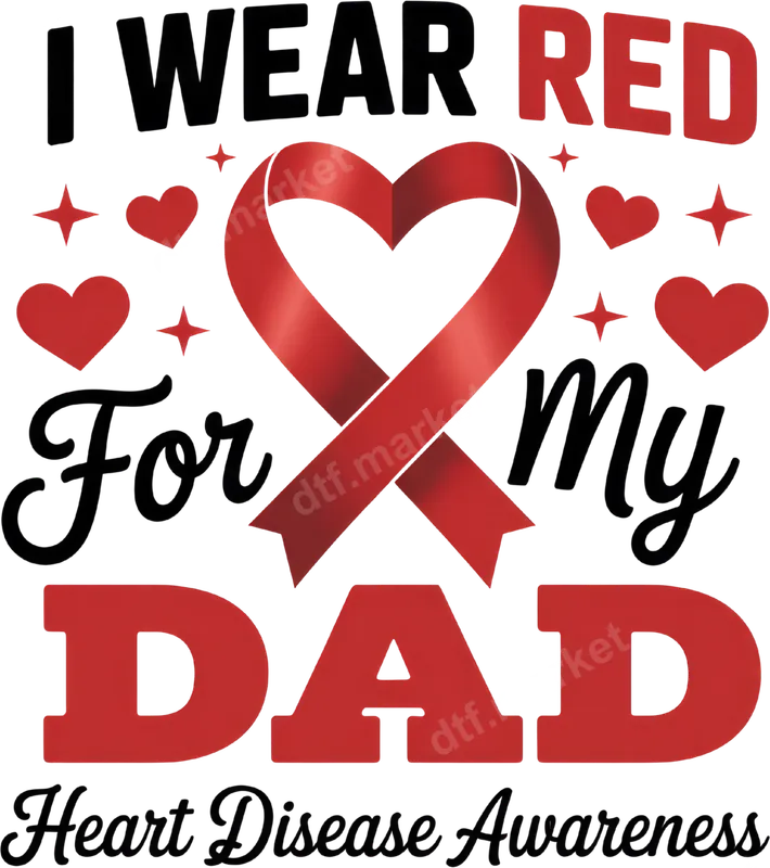 See allThis impactful DTF transfer proudly declares, "I WEAR RED For my DAD Heart Disease Awareness," featuring a prominent red ribbon shaped into a heart, accented with smaller hearts and stars. This ready to press design is a powerful statement of solidarity and love, perfect for anyone wishing to honor their father battling heart disease or to raise general awareness. The vibrant red graphics stand out, ensuring your message is seen and felt, making it an ideal heat transfer for personalizing apparel. This design is dedicated to family members, especially children, wanting to support their fathers affected by heart disease. It's perfect for awareness walks, fundraising events, family gatherings, or simply for everyday wear to keep the message alive. It also makes a thoughtful and meaningful gift for siblings or other relatives who share the same cause. Show your unwavering love and commitment to your dad's health journey with this heartfelt iron on transfer. Our premium DTF transfers are incredibly versatile, ready to be applied effortlessly with a heat press or even a household iron. They adhere beautifully to a wide array of materials including cotton, polyester, and various fabric blends. For best results, we recommend pressing at 300-325°F for 15 seconds with medium pressure. Unlike traditional vinyl transfer designs, there's absolutely no weeding required, saving you time and effort. Simply press and peel for a professional finish. Experience the exceptional quality of our direct to film transfers. Each t-shirt transfer is engineered for vibrant colors, outstanding durability, and a soft, flexible feel that resists cracking and peeling, wash after wash. Crafted using professional-grade DTF film and strong adhesive, these heat press ready designs ensure your message remains clear and bold on any apparel, offering a retail-quality finish that looks fantastic on shirts, bags, and more.