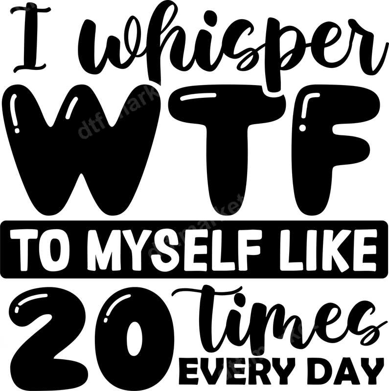 See allInject some honest humor into your wardrobe with our 'I Whisper WTF To Myself Like 20 Times Every Day' DTF transfer. This hilarious design perfectly captures relatable daily exasperation, featuring a mix of playful script and bold bubble letters. It's a premium quality direct to film transfer, offering crisp black text that stands out on any garment. This ready to press design makes it simple to create a custom look that speaks your mind. This funny heat transfer is ideal for anyone who lives through their day with a constant internal monologue. Perfect for busy individuals, stressed students, overworked professionals, or anyone with a dry sense of humor. It makes an excellent gift for friends, coworkers, or family who appreciate a good laugh and aren't afraid to express their sarcastic side. Great for casual wear, weekend outings, or as a fun conversation starter. Applying your new apparel transfer is a breeze, whether using a professional heat press or household iron. Our high-quality iron on transfer adheres perfectly to a wide range of fabrics including cotton, polyester, and most blends. For best results, use a heat press at 300-325°F for 15 seconds with medium pressure, then cold peel. Unlike traditional vinyl transfers, there's no weeding required, saving you time and effort. Experience the superior quality of our DTF transfers. These heat press designs are known for their vibrant color retention, impressive durability, and resistance to cracking or peeling, even after multiple washes. The print feels soft to the touch, seamlessly blending with the fabric. Each transfer is produced using professional-grade DTF film and inks, ensuring a long-lasting, high-quality finish for your custom t-shirts, hoodies, and other personalized items.