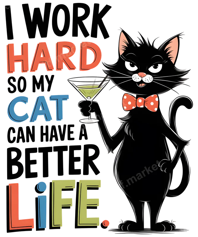 See allThis vibrant DTF transfer features a sophisticated black cat in a polka-dot bow tie, confidently holding a martini glass, alongside the humorous phrase "I WORK HARD SO MY CAT CAN HAVE A BETTER LIFE." The playful design, with its mix of bold and colorful typography, perfectly captures the dedication and affection cat owners have for their pampered pets. This high-quality ready to press transfer is ideal for adding a touch of humor and personality to any garment. This funny heat press design is a must-have for devoted cat parents, animal lovers, and anyone with a witty sense of humor. It makes an excellent gift for birthdays, Mother's Day, Father's Day, Christmas, or just because, for friends and family who understand the true meaning of feline extravagance. Perfect for casual wear, pet adoption events, or simply expressing your love for your furry overlord. Our direct to film transfers are designed for easy application on a wide range of materials, including cotton, polyester, and various fabric blends. For best results, use a heat press at 300-325°F for 15 seconds with medium pressure. While a heat press is recommended, you can also achieve great results with a household iron following specific instructions. Enjoy a hassle-free process with no weeding required, making custom apparel creation simple and fun. Experience professional-grade results with our premium DTF film. Each apparel transfer boasts vibrant, crisp colors that resist cracking and peeling, ensuring your design looks fantastic wash after wash. The finished graphic offers a soft, smooth feel on your garment, blending seamlessly with the fabric. These durable iron on decals provide a long-lasting, high-quality finish for all your custom apparel projects.