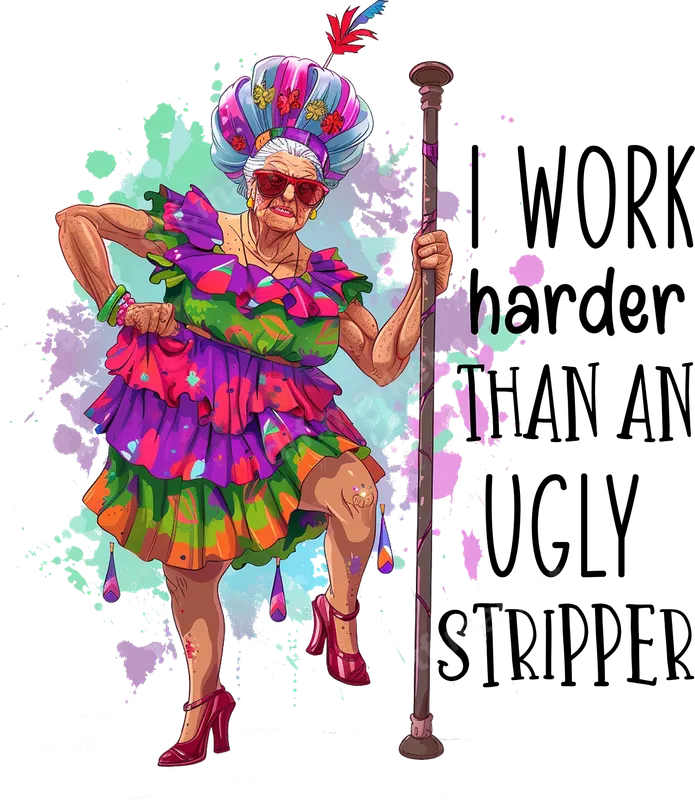 See allThis vibrant and hilarious DTF transfer features a sassy, cool grandma-like character with colorful attire and the bold statement: "I WORK harder THAN AN UGLY STRIPPER." The design bursts with personality, combining playful colors with an irreverent attitude, perfect for anyone who hustles hard and isn't afraid to show it. This high-quality direct to film transfer is ready to press onto your favorite apparel. This funny iron on transfer is ideal for anyone with a great sense of humor and a strong work ethic, whether it's for a busy entrepreneur, a dedicated mom, or a hard-working friend. It makes a fantastic gag gift for birthdays, retirement parties, or just to celebrate someone's tireless efforts with a dose of adult humor. Perfect for adding a unique touch to casual wear, making a statement at social gatherings, or simply bringing a smile to your own face. Applying this heat press transfer is incredibly easy and efficient. Our ready to press transfers work seamlessly on a wide variety of materials, including cotton, polyester, and various fabric blends. For best results, use a heat press at 300-325°F for 15 seconds with medium pressure. No specialized equipment? You can also use a household iron, making it accessible for everyone. Plus, there's no tedious weeding required, saving you time and effort. Experience superior quality with this durable apparel transfer. Our DTF prints boast incredibly vibrant colors that pop, ensuring your design stands out. They are designed to be crack-resistant and offer a soft, smooth feel on your garment, unlike traditional vinyl transfers. Made with professional-grade DTF film and a strong adhesive, this shirt design will withstand countless washes and maintain its integrity, ensuring a long-lasting, professional finish.