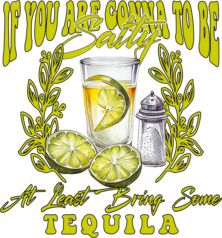 See allThis hilarious DTF transfer features the phrase "IF YOU ARE GONNA TO BE Salty At Least Bring Some TEQUILA" in vibrant lime green fonts. The design showcases a detailed shot glass of tequila with a lime wedge, accompanied by two fresh lime halves and a classic salt shaker, all framed by stylized botanical elements. It's a ready to press design that perfectly captures a fun, sarcastic, and lighthearted party vibe, ideal for injecting humor into any garment. This adult-humor heat transfer is perfect for tequila lovers, social butterflies, and anyone with a witty sense of humor. It makes an excellent gift for birthdays, bachelorette parties, Cinco de Mayo celebrations, or just a fun night out with friends. Transform plain t-shirts, tank tops, or tote bags into conversation starters, or create custom apparel for your next casual gathering or backyard BBQ. It's also a fantastic iron on decal for those who appreciate sarcastic sayings. Our premium apparel transfer works beautifully on a wide variety of fabrics, including cotton, polyester, and cotton/poly blends. Application is straightforward: simply use a heat press at 300-325°F for 15 seconds with medium pressure, or apply with a household iron. Unlike traditional vinyl transfers, there's absolutely no weeding required, saving you time and effort. Just press and peel for a professional finish. Experience superior quality with our direct to film transfers. The colors are incredibly vibrant, ensuring your design pops on any fabric, and the transfer is highly crack-resistant for long-lasting wear. Each shirt design feels soft to the touch, seamlessly blending with the garment without a heavy, bulky feel. Crafted on professional-grade DTF film with strong adhesive, these heat press designs provide durability and a premium look that will impress.