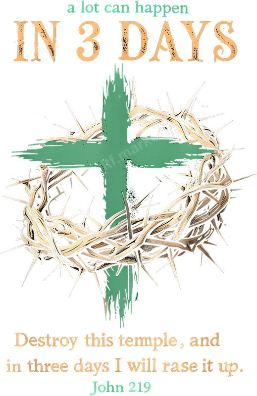 See allThis powerful DTF transfer beautifully symbolizes the resurrection, featuring the impactful text "a lot can happen IN 3 DAYS" above a distressed green cross intertwined with a thorny crown. Below, the design includes the profound biblical quote, "Destroy this temple, and in three days I will rase it up. John 219." This vibrant, ready to press design perfectly blends artistic expression with deep spiritual meaning, making it an excellent statement piece for believers. This inspiring design is ideal for devout Christians, church members, youth groups, and anyone wishing to share their faith proudly. It makes a thoughtful heat transfer for Easter celebrations, Good Friday observances, or as a powerful everyday statement. A meaningful gift for baptisms, confirmations, or to encourage a fellow believer, this iron on transfer brings spiritual depth to any garment. Our premium DTF transfer works flawlessly on a wide range of materials, including cotton, polyester, and various fabric blends. Applying this ready to press transfer is simple: use a heat press at 300-325°F for 15 seconds with medium pressure, or follow instructions for a household iron. Enjoy a professional finish without the hassle of weeding, making it an ideal t-shirt transfer for quick customization. Crafted with high-quality DTF film and strong adhesive, this heat press design ensures vibrant colors and crisp details that last. It's crack-resistant, peel-resistant, and offers a soft, smooth feel on your apparel, unlike traditional vinyl transfers. Create custom Christian apparel with confidence, knowing your apparel transfer will stand the test of time and wash cycles.