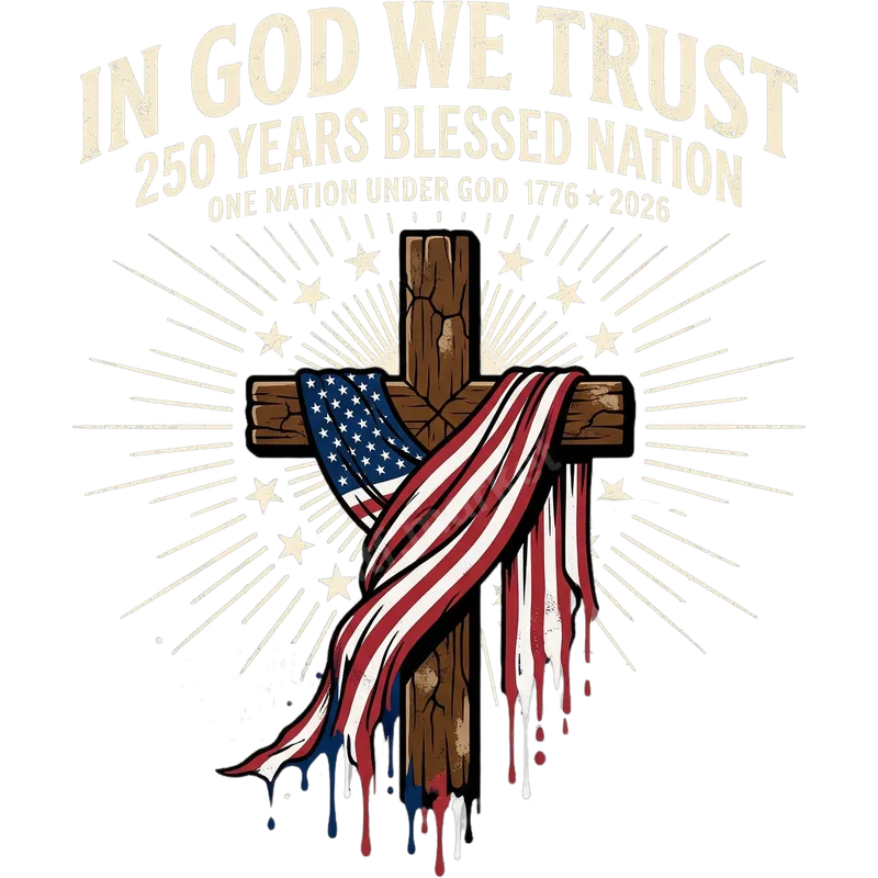 See allThis powerful DTF transfer features a rustic wooden cross draped with a distressed American flag, symbolizing faith and nation. Above, the bold declaration 'IN GOD WE TRUST' is prominently displayed, accompanied by '250 YEARS BLESSED NATION' and the significant dates 'ONE NATION UNDER GOD 1776 ★ 2026'. This ready to press design perfectly blends patriotism and spiritual conviction, making a profound statement on any apparel. Perfect for patriotic Americans, devout Christians, and history enthusiasts celebrating the nation's 250th anniversary. This heat transfer is ideal for Fourth of July events, Memorial Day, patriotic rallies, church gatherings, or everyday wear to express your beliefs. It makes a thoughtful gift for veterans, service members, or anyone proud of their faith and country. Applying this stunning heat press design is effortless. Our high-quality iron on transfer works seamlessly on a wide range of materials, including cotton, polyester, and various fabric blends. For best results, use a heat press at 300-325°F for 15 seconds with medium pressure. Unlike traditional vinyl transfer, there's no weeding required, ensuring a quick and clean application. Experience superior durability and vibrant colors with our professional-grade DTF film. Each apparel transfer is crafted to be crack-resistant, peel-resistant, and soft to the touch, ensuring your design looks fantastic wash after wash. The strong adhesive ensures a lasting bond, making this a premium choice for custom garments that stand the test of time.