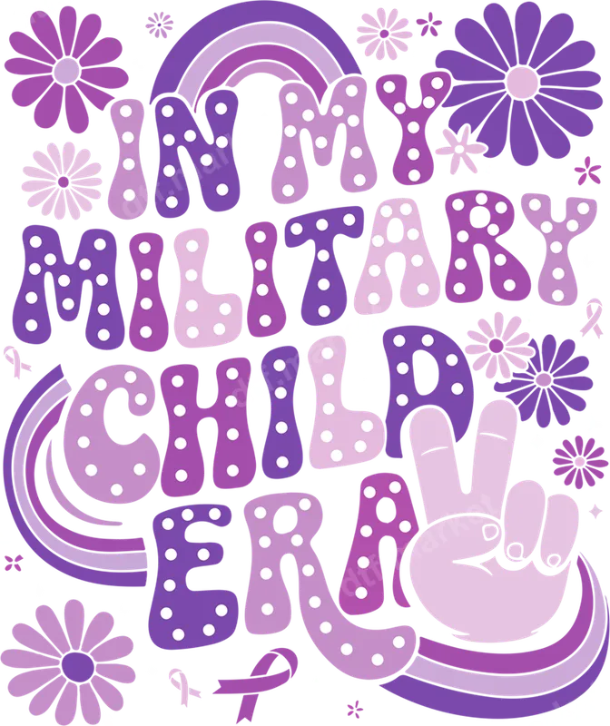See allThis vibrant "In My Military Child Era" DTF transfer features a retro groovy design, celebrating the unique experience of growing up in a military family. Adorned with playful polka-dotted bubble letters in shades of purple, it evokes a nostalgic 70s aesthetic. Swirling rainbows, cheerful daisy flowers, peace signs, and subtle awareness ribbons complete this heartfelt and stylish statement. This high-quality direct to film transfer is ready to press, bringing a touch of vintage charm and pride to any garment. This special heat transfer design is perfect for military children, dependents, and families looking to proudly display their identity and experience. Ideal for Military Child Month (April), Veteran's Day, family reunions, school events, or as a thoughtful gift for a loved one in a military family. It's a fantastic way to acknowledge the sacrifices and strength of military kids, adding a unique and personal touch to their everyday wear or special occasion outfits. Applying this eye-catching iron on transfer is incredibly simple, making it suitable for both professional crafters and DIY enthusiasts. It adheres beautifully to a wide range of fabric types, including cotton, polyester, and various blends. For best results, use a heat press at 300-325°F for 15 seconds with medium pressure. Even a household iron can achieve great results by following our easy instructions. Best of all, there's no tedious weeding required, so you can achieve a professional finish effortlessly. Our premium heat press ready transfers are crafted using professional-grade DTF film, ensuring exceptional durability and a superior finish. Experience vibrant colors that pop and remain brilliant wash after wash, without cracking or fading. The design offers a remarkably soft hand feel once applied, seamlessly integrating with the fabric. Each apparel transfer features a strong adhesive, guaranteeing a long-lasting bond to your chosen garment, creating a custom piece you'll cherish.